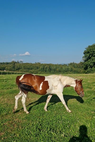 Szukamy 5-gwiazdkowego domu dla naszej "Phoebe". Słodka klacz rasy Paint (ur. 2023) ujrzała z nami światło dzienne. Jej rodzice również są na naszej farmie: Matka: Indiana Ojciec: Zippos King Bar Jej pełną siostrę z 2024 roku również można zobaczyć na naszej farmie. Phoebe ma wszystko, czego można sobie życzyć: Silna, poprawnej budowy, absolutnie nieustraszona, bardzo lubiąca ludzi i zawsze otwarta na nowe rzeczy. Nauczyła się wszystkiego, co trzeba wiedzieć w tym wieku: Przycinanie kopyt, prezentacja przed kowalem, pielęgnacja, prysznic/mycie, chodzenie/prowadzenie. Phoebe ma wszystkie podstawowe szczepienia i jest regularnie odrobaczana. Posiada paszport konia. Obecnie jest wychowywana z innymi młodymi końmi. Może zostać tutaj w celu dalszego wychowania lub przenieść się do nowego domu. Jeśli chcesz poznać Phoebe, po prostu napisz do nas.