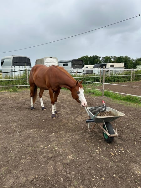 Diese bildhübsche Paint Horse Stute, geboren im Juni 2022, mit einem Stockmaß von ca. 151 cm und in der Farbe Sorrel Tobiano, überzeugt durch einen ausdrucksstarken Kopf, ein korrektes und kräftiges Fundament sowie eine sehr harmonische Gesamterscheinung. Käthe deckt auch größere Reiter gut ab und ist sowohl optisch als auch charakterlich ein echter Hingucker. Die Stute ist gesund, Röntgenbilder von Hufrolle und Sprunggelenken liegen ohne Befund vor, PSSM1 n/p, hat aber keinerlei Symptome und man merkt ihr nichts an. Sie wurde regelmäßig physiotherapeutisch und chiropraktisch durchgecheckt, die Zähne wurden alle halbe Jahre kontrolliert, sie ist regelmäßig geimpft und entwurmt sowie schmiede- und verladefromm. Sie kennt 24/7 Heufütterung, steht nachts in der Box und ist sowohl Boxen- als auch Herdenhaltung gewohnt, dabei sehr gut sozialisiert. Charakterlich ist sie sehr menschenbezogen, verschmust, neugierig, ausgeglichen und unkompliziert. Im Umgang ist sie super brav, möchte ihrem Reiter immer gefallen und gibt im Training stets 100 %. Unter dem Sattel zeigt sie sich sehr talentiert, lernwillig, super rittig, ausbalanciert und bereits gut gefestigt, zudem ist sie super weich zu sitzen. Käthe besitzt eine gute Westerngrundausbildung, dreht und macht sehr gut mit bei der Bodenarbeit. Sie lässt sich auch brav von einem neunjährigen Kind reiten, dennoch ist sie aufgrund ihres jungen Alters und des frühen Ausbildungsstandes kein reines Anfängerpferd. Durch ihre sehr gute Reining-Abstammung ist sie sowohl für ambitionierte Freizeitreiter als auch für den späteren Sporteinsatz interessant und eignet sich ideal für Reiter, die Sport und Freizeit miteinander verbinden möchten. Eine junge Stute mit tollem Charakter und viel Potenzial für ihre weitere Ausbildung.