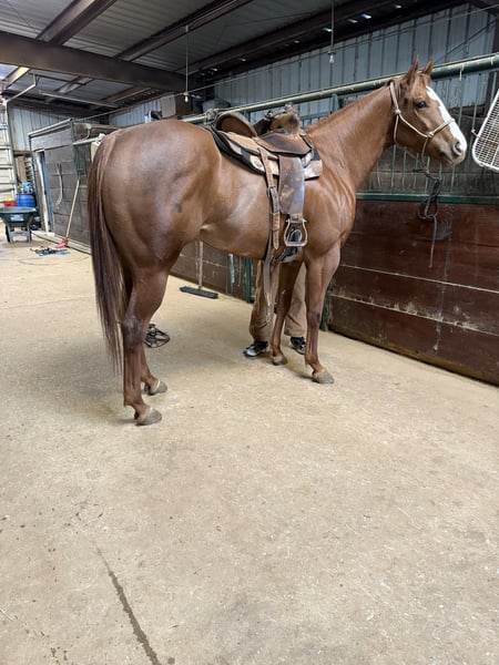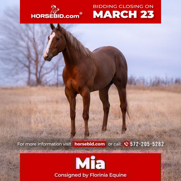 ⚜️𝓽𝓱𝓮 𝐆𝐎𝐋𝐃 𝓢𝓮𝓵𝓮𝓬𝓽⚜️ Happening now thru MONDAY | MARCH 23rd - Available EXCLUSIVELY on HorseBid's website! For more details and to register visit: www.Horsebid.com CONSIGNOR CONTACT: Florinia Equine 572-205-5282 LOCATION: Edmond Oklahoma BREED: Apha REGISTERED: Yes REGISTERED NAME: Goldrod COLOR: Sorrel HEIGHT: 16.3 AGE: 4 GENDER: Mare What an opportunity for someone looking for blacktype breeding with current money earnings! Mia is a 4 yr old mare who had her first career on the track! She has been home and being ridden on the ranch and is ready for her next career! Mia is completely sound clean and correct every way. She is loping correct circles trail rides and has pushed cattle. On the track she was impressive with two wins! and lighting the board multiple other occasions lifetime earnings to date is 16,750. Mia has an exceptional mind she is quiet and will stand tied never any funny business never fresh she is very work minded she is gorgeous standing 16.3 will make an outstanding broodmare addition one day her breeding speaks for itself she is truly a hard to find gem!! Offered by Florinia Equine please call anytime for questions 572-205-5282