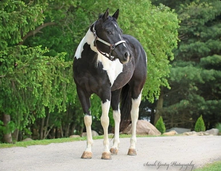 ONLINE AUCTION Place your bids at www.PlatinumEquineAuction.com Starting Bid $3500 Auction ends October 20th, 2024 Need a new saddle? Check out White Rock Saddles on our website or Facebook! Breezin Tazzy Cat aka Sweet Pea is a 4 year old registered American Paint Horse with the kind of markings that never fail to turn heads anywhere that she goes. Taris Breezin Cat quickly earned her barn name (Sweet Pea) as she is truly one of the kindest, gentlest, and most willing mares that you will ever meet in your life, we can guarantee you that! Taris Breezin Cat aka Sweet Pea stands 14.2 hands high. Her sire is accomplished stallion Meradas Cat Alena and her grand sire is the one and only Cats Merada who boasts an overall LTE of 5 MILLION dollars! Sweet Peas dam is a 1D barrel horse that won her 2 year old futurity.(her dam was foaled in 1997) Mr. Star Breeze (her dams sire) has sired many horses that have been succesful in roping events, barrels, as well as poles. Sweet Peas has always been brought along in her riding journey slowly and correctly and we absolutely welcome a PPE at buyers expense. We also are more than happy to allow any serious buyers the opportunity to ride her themselves to see just how fabulous this mare truly is for yourself. She has been ridden extensively and will go in English tack, Western tack, or even bareback. Sweet Pea ois one of the smoothest moving mares that you will ever have the pleasure of swinging a leg over. This mare has been started slowly and correctly and has always been sound and will hold up a LOT LONGER AND BETTER than the horses that were pushed really hard as a 2 or 3 yo. She may only be 5 years old but this mare is one of a kind and always keeps her cool whenever she has been presented with anything new. She has been used in our lesson program and has shown her ability to adapt to just about and level or age of rider. This mare is the kind of horse to stop her all youve got to do is say the word whoah and sit in your seat and she will tuck her butt and come to a sliding stop. She also been ridden on the road as well as crosses bridges, obstacles, and tarps etc. Sweet pea is also trick trained and her tricks she can perform are laying down for mounting, bowing, as well as sitting down. She has participate in a 4 day 3 night trail ride where she put in 35 miles on the trails with varying levels of riders throughout the trip. She even rode from Pleasant Hill Lake Park all the way to Mount Geez and had to cross roads, rivers, and fallen limbs etc in order to make the ride. She is truly the definition of a push button style horse that goes in whatever direction you ask at whatever speed that you ask for. She also has very good verbal cues on the ground as well as under saddle. Our three year old son actually often gets her out of her stall and can lead her without issue. Sweet Pea has also been swam bareback through our pond and even into the deep end where she cannot touch. I was even amazed at just how quickly she was able to pickup riding completely bridleless through our obstacle course without any worry or concern. I also have to say that she has fantastic ground manners and also is started on some liberty work as well. She also has been over smaller jumps in English tack a handful of times and also has worked cattle a couple times as well. We have lots going on at our facility like tractors , cats, kids, dogs, side by sides, and even a back hoe and shes never been bothered by any of it. She has always had such a softness and quietness about her demeanor she truly is an old soul with the mind of a horse easily twice her age. We definately will miss having her with us because she often my go to for a variety of different jobs and activities and due to her safe nature and willing to please mindset. Sweet Pea is also fantatic about loading into a trailer, hauling new places, for the ferrer/vet, worming, as well as cross tying or standing on a highline overnight. She is on the middle of the totem pole when turned out with other horses and get along with every horse that we hvae introduced her to. Sweet Pea is extremely versatile and could go any direction such as staying a lesson horse, trick riding, Liberty work, Roping, Trail, Contesting, cutting and Penning, or even a super cute Hunter/Jumper. Sweet Pea has a current Coggins/Health certificate and we can help get you setup with a couple reputable haulers that are reasonably priced. We have a signed transfer through American Paint Horse Association so that buyer can get her transferred into their name as well. If you have any questions about Breezin Tazzy Cat aka Sweet Pea or would like to schedule a day to come meet and ride her at our facility in Ashland Ohio. Call or text Jonas Miller 419-512-7885. ONLINE AUCTION Place your bids at www.PlatinumEquineAuction.com Starting Bid $3500 Auction ends October 20th, 2024 Need a new saddle? Check out White Rock Saddles on our website or Facebook!