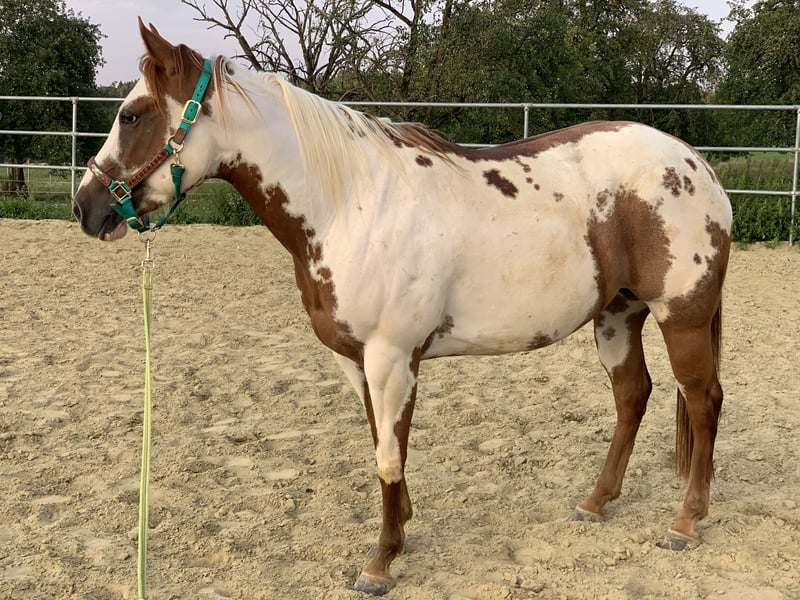 For sale is my 6-year-old Paint mare Ivy, she is approximately 152 cm tall and has full papers (pedigree see photos). She was with the breeder until her 2nd year of life, growing up in a herd environment, and I bought her in 2021. Until she was 4 years old, she enjoyed basic training and was gently and slowly trained by me, riding Western. I did most of the training myself, but also had trainers for lessons. Ivy lives in a paddock, but is also familiar with stalls. She is used to 24/7 hay and pasture. In the herd, she is in the middle of the hierarchy. Mares and geldings are both no problem for her. She was barefoot for a long time, had 4 hoof boots in between, special shoes in front, and is currently barefoot again. Unfortunately, she suddenly went lame in October 2024. At the veterinary hospital in Zurich, a sole disease was diagnosed. Currently, she is sound after multiple leech treatments. Additionally, she carries PSSM2 (MIM) n/p8, which is manageable with a tailored mineral feed and possibly covering her. In handling, she is absolutely well-behaved, always manageable, enjoys being worked with, and wants to please. She is happy to see everyone and does not necessarily need a specific person. Out in the field, she is super sweet both alone and in a group; tractors, dogs, children, etc., are no problem for her. She is very well-behaved with the veterinarian and farrier, and has had regular osteopathy treatments and vaccinations. Ivy is NOT being sold as a breeding mare and should also not participate extensively in competition sports. I wish for her to have an absolute best home, preferably a paddock with plenty of pasture. She can be ridden, but only to a limited extent due to her leg diagnosis. She loves trail riding, groundwork, outings, etc. Due to the diagnosis, I placed her on a huge pasture in May, where she can simply be a horse and recover. This has been very beneficial for her. She is currently untrained and therefore cannot be tried under saddle. In the fall, I will bring her back to the stable and train her again, at which point she can be tried under saddle. I am not in a hurry, so I will take my time to find the right person for her. It's about finding the right home over price, and I will only let her go to a 5-star home.