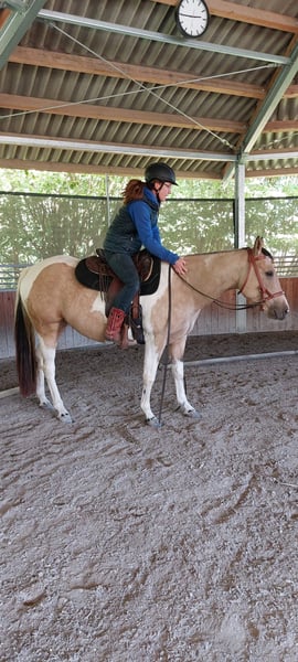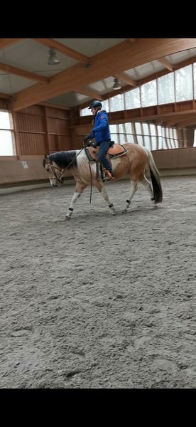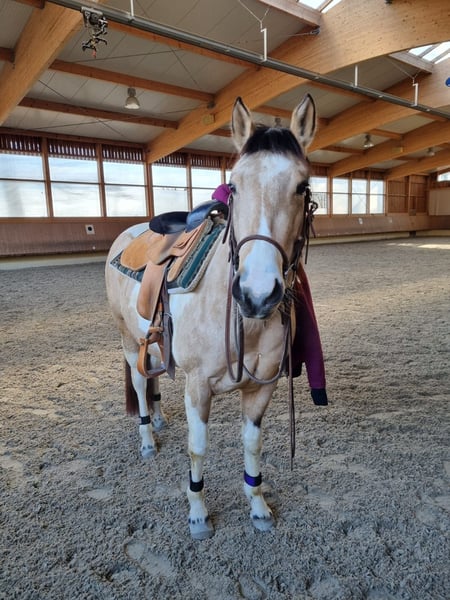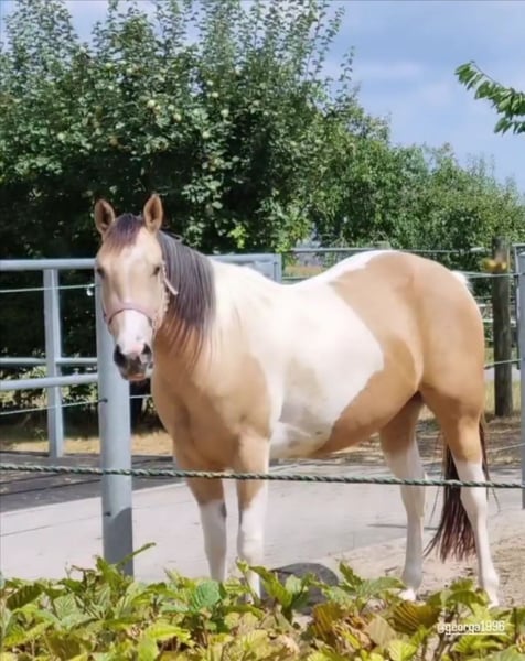 Zum Verkauf steht eine hübsche Paint Horse Stute, geboren am 8. März 2019, in der seltenen und auffälligen Farbe Buckskin Tobiano. Sie hat ein aktuelles Stockmaß von ca. 1,46 m. Die Stute ist sehr lieb im Umgang, menschenbezogen und kennt das Leben in der Herde, in der sie aktuell auch steht. Sie war insgesamt neun Monate im Beritt, wurde jedoch seit 2024 nicht mehr gearbeitet. Daher sollte sie nun wieder langsam und schonend gefördert werden. Sie ist eine eher sensible Stute, die einen ruhigen, fairen Reiter mit Gefühl braucht und daher kein Anfängerpferd ist. Mit der richtigen Förderung bringt sie jedoch viel Potenzial mit. Gesundheitlich ist sie MYHM-Einzelträger (n/My), hatte bisher keinerlei Auffälligkeiten oder Einschränkungen, und sie verfügt über Papiere. Wir wünschen uns für sie ein passendes Zuhause – Abgabe nur in artgerechte Haltung. Händler und Reitschulen sind zwecklos. Bei ernsthafter Interesse und weiteren Fragen gerne melden.