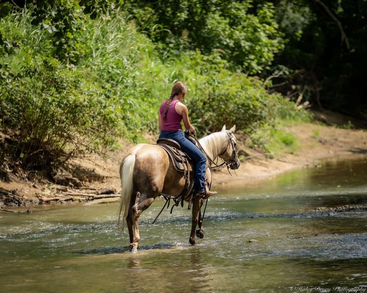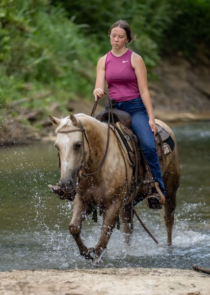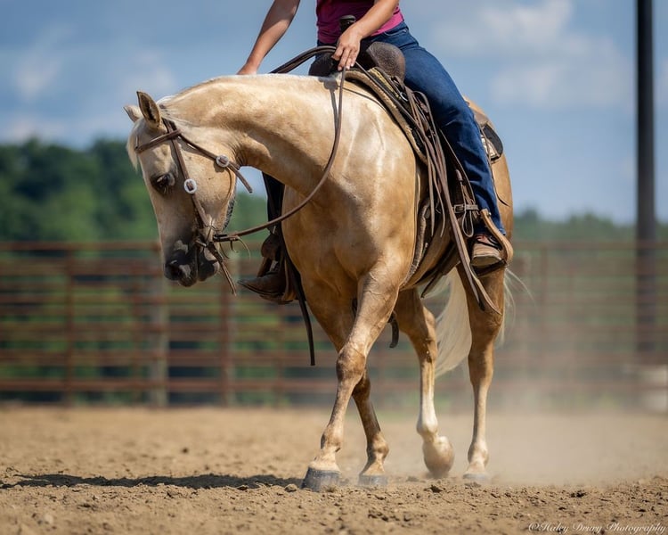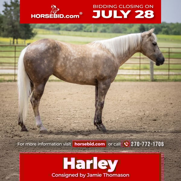 ⚔️ The HORSEMAN's Select ⚔️ Happening now thru MONDAY | JULY 28th - Available EXCLUSIVELY on HorseBid's website! For more details and to register visit: www.Horsebid.com CONSIGNOR CONTACT: Jamie Thomason 270-772-1706 LOCATION: Auburn, KY BREED: APHA REGISTERED: Yes REGISTERED NAME: CASHED N DIAMONDS COLOR: Palomino HEIGHT: 14 AGE: 8 GENDER: Mare Introducing CASHED N DIAMONDS, respectfully known as Harley! An 8 yr old, APHA, palomino mare, standing 14 hands. An own daughter of NRHA Million Dollar Sire, BIG CHEX TO CASH with LTE of $220,826 & Offspring Earnings of $1,342,000+. In the arena, out on the trail, heeling steers in the roping pen, or working on the ranch this pretty lady is not only there to get the job done, but to get it done with style! Harley has a beauty that is unmatched, paired with flawless conformation, and the training to be an asset in a variety of disciplines. Harley is soft in the face, travels both directions collected & on the correct lead. Moves laterally off leg pressure, has a smooth stop, and a nice turn around. On the trail, Harley rides alone or in a group, crosses water, downfall, and navigates rough terrain. She is no stranger to a days work. Has been taken out west to brandings, used to move cattle on the farm alongside working stock dogs, open & closes gates. She’s quiet in the roping box, scores well, has quick speed that would easily transition to breakaway or the barrel pattern. Truly a versatile horse! If you're searching for the perfect partner…..whether it's a horse for the arena, a standout in the roping pen, a fun trail companion to explore the great outdoors, or a mare with the pedigree, presence, and conformation ideal for a broodmare—Harley is your girl! With her versatile talent, proven bloodlines, and eye-catching looks, she checks all the boxes for riders and breeders alike. Don't miss the chance to add this exceptional mare to your barn! For any other question or if you would like to meet Harley in person before adding her to your family, feel free to reach out!
