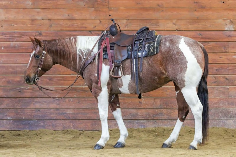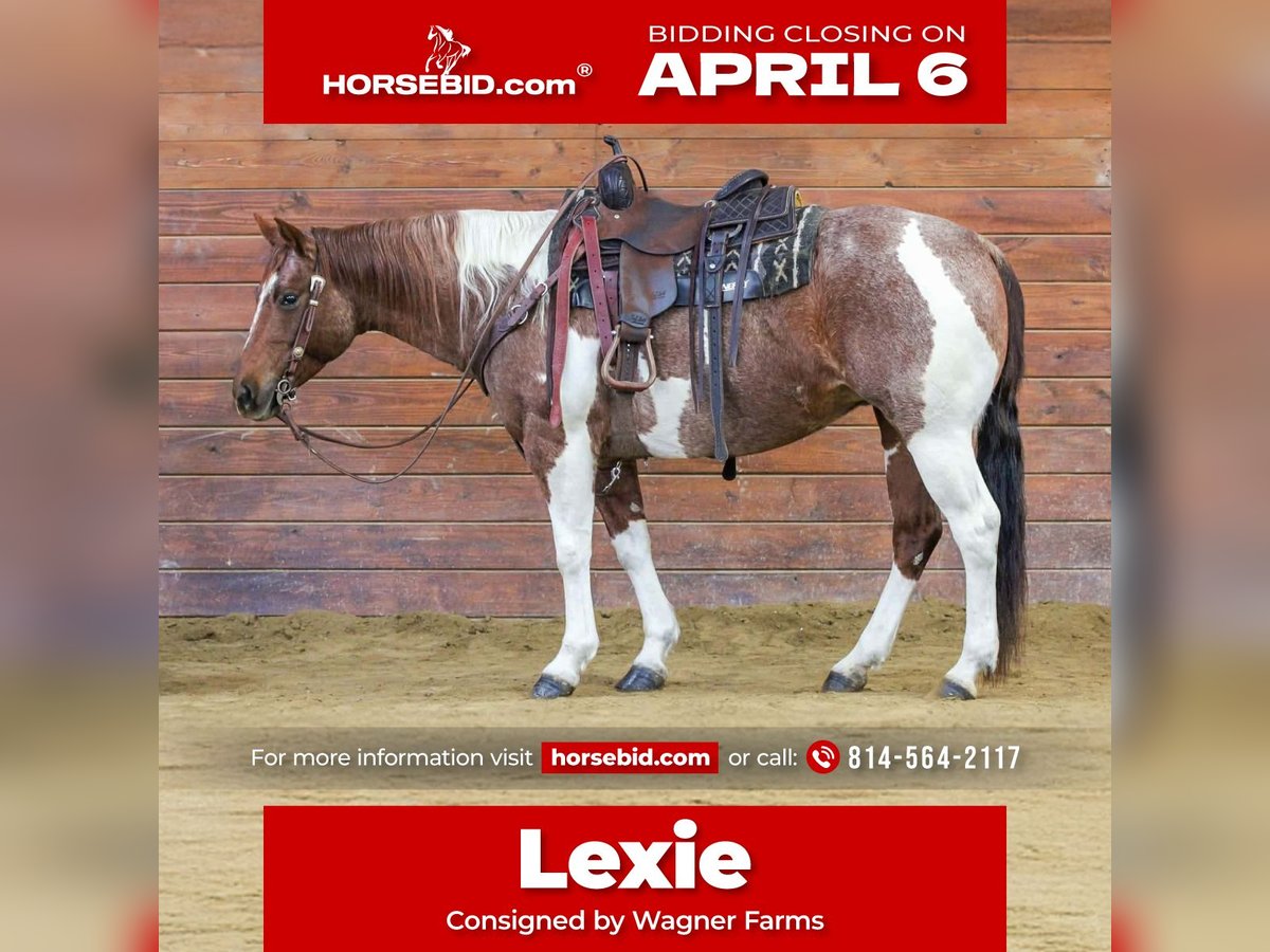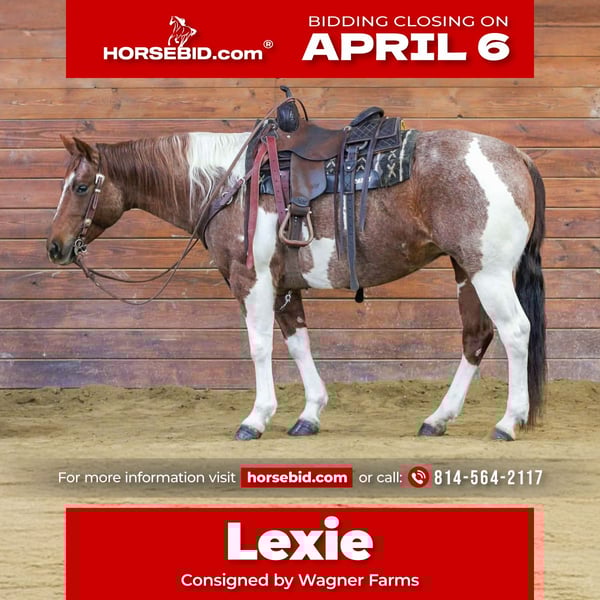 🌟𝑨𝒑𝒓𝒊𝒍 𝐀𝐋𝐋 𝐒𝐓𝐀𝐑 𝐋𝐈𝐍𝐄𝐔𝐏🌟 Happening now thru MONDAY | APRIL 6th - Available EXCLUSIVELY on HorseBid's website! For more details and to register visit: www.Horsebid.com CONSIGNOR CONTACT: Wagner Farms 814-564-2117 LOCATION: Clarion, PA BREED: Paint REGISTERED: Yes REGISTERED NAME: Dirty Sandra COLOR: Red Roan and White Paint HEIGHT: 14.3 AGE: 8 GENDER: Mare Dirty Sandra or as we call her around the barn Lexie. Lexie is a Registered American Paint Horse. She is a pretty red roan and white paint color. Very Unique! Not only is she very good looking but she also rides the very best and has a great disposition. Wether you want a finished ranch horse to go out and work all day and do any job on the ranch or a quiet all around family horse to go out on a relaxing trail ride. She is exactly both of those and much more. Great handle on her. One hand neck rein, ride bareback or with saddle . Nothing phases her or rattles her she is always calm , cool and collective. Seasoned and reliable and dependable . She also rides nicely in the arena. Let her sit in the stall for few weeks pull her out and she will stay good broke and gentle. She does good with time off. SAFE ALL AROUND HORSE! Sheh as good breeding and is by a son of Peptoboonsmal and also has Grays Starlight on her papers. Dont miss out on this all around good broke registered safe red roan and white paint. We can help arrange delivery anywhere in the United States. Call Glory at 814-564-2117. Thank You and God Bless