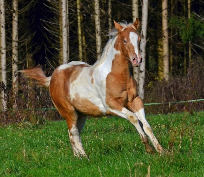 Babatte is a Paint Horse filly in Gold Champagne, homozygous for the Champagne gene. She was presented at the PHCG breeding show and received an impressive overall score of 7.95. She is 7 Panel N/N and naturally has full Paint papers. She is growing up in a large herd in a species-appropriate manner. Her character is golden, and she always wants to please. She loves to cuddle and seeks human closeness in a gentle way.
