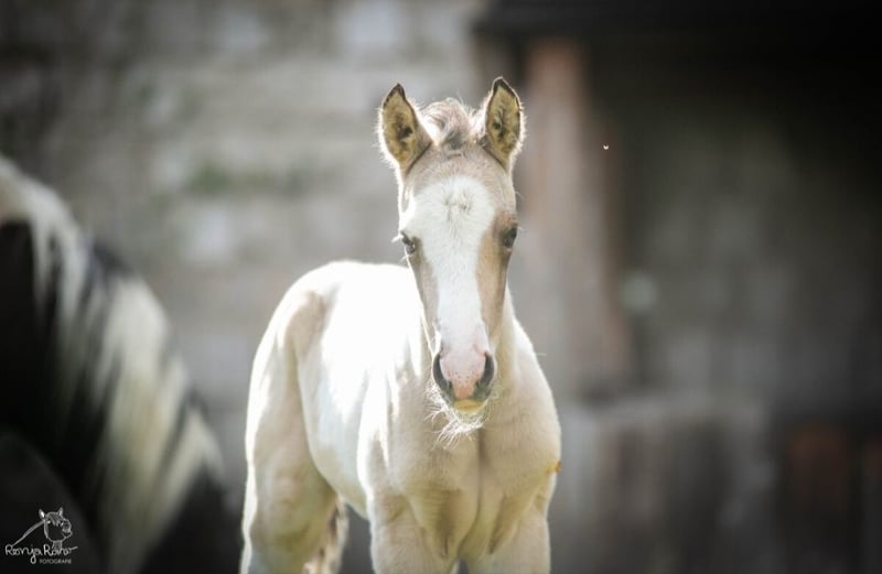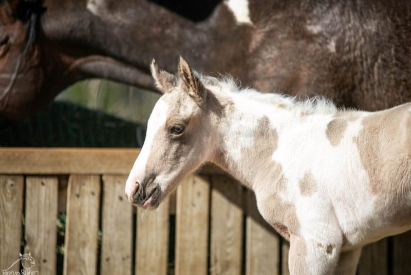 🌸 Hi, ich bin die kleine Willka (indianisch= Sonne) und bin ein buckskin Tobiano Stutfohlen. Geboren wurde ich im April 2026. Mein Papa ist Taris Bright Side , ein 151 cm großer Paint Hengst mit allerbester Abstammung und 100% Scheckvererbung (7Panel n/n). Meine Mama ist FS Olenas Blue Chip (1,52). Meine Mama ist 6Panel n/n. Ich bin vom ersten Tag an ein richtiger Sonnenschein, der ganz viel kuscheln will. Wenn ich groß bin, werde ich so etwa ein Endmaß von ca. 1,50 - 1,52 m bekommen. Schon jetzt bin ich ein sehr kräftiges und muskulöses Fohli. Mutig und selbstbewusst setze ich mich mit allem Neuen auseinander und erkunde freudig die Welt um mich herum. Ich wachse in einer gemischten Herde in einer Paddocktrail-Haltung auf. So kann ich ganz viel laufen, spielen und futtern, wie ich will. Und die Großen bringen mir auch bei, dass es auch für kleine Fohlen Grenzen gibt, die einzuhalten sind. Ich wünsche mir, dass das auch so bleibt. In eine Box möchte ich nicht, auch nicht nachts. Bei meinem Auszug, ab Dezember, bringe ich selbstverständlich meinen Equidenpass vom PHCG und die APHA- Papiere mit. Sollten Sie sich ernsthaft für die kleine Willka interessieren, möchten wir Sie herzlich darum bitten, sich und Ihre Haltungspläne kurz vorzustellen. Hi, ich bin die kleine Willka – mein Name bedeutet auf Indianisch Sonne. Ich bin ein buckskin Tobiano Stutfohlen und wurde im April 2026 geboren. Mein Papa ist Taris Bright Side, ein 151 cm großer Paint-Hengst mit bester Abstammung und 100 % Scheckvererbung (7-Panel n/n). Meine Mama ist FS Olenas Blue Chip mit einem Stockmaß von 1,52 m (6-Panel n/n). Schon vom ersten Tag an bin ich ein echter Sonnenschein, verschmust und menschenbezogen. Wenn ich ausgewachsen bin, werde ich voraussichtlich ein Endmaß von ca. 1,50 bis 1,52 m erreichen. Bereits jetzt bin ich kräftig gebaut und muskulös. Mutig, selbstbewusst und neugierig entdecke ich voller Freude die Welt um mich herum. Ich wachse in einer gemischten Herde in artgerechter Paddocktrail-Haltung auf. Dort kann ich viel laufen, spielen und mich frei bewegen. Von den Großen lerne ich außerdem, dass es auch für kleine Fohlen Regeln und Grenzen gibt. Für meine Zukunft wünsche ich mir ebenfalls eine Haltung mit viel Bewegung, Sozialkontakt in Form eines Offenstalls, Aktivstalls oder Paddocktrail. In eine Boxenhaltung möchte ich nicht. Ab Dezember darf ich in mein neues Zuhause umziehen. Natürlich bringe ich meinen Equidenpass vom PHCG sowie meine APHA-Papiere mit. Wenn Sie ernsthaftes Interesse an der kleinen Willka haben, freuen wir uns über eine kurze Vorstellung von Ihnen und Ihren Haltungsplänen.
