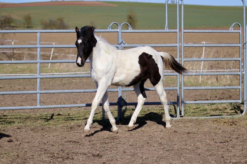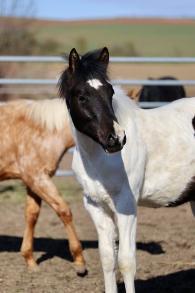 Raven is a cuddly and well-behaved foal. He is already familiar with basic foal training and is learning very quickly. He may be homozygous for Black and Tobiano, but this has not yet been tested. He is also accustomed to trailer loading. Breed: Paint Horse (APHA papers and E-Pass from PHCG) Sire: Rocky Mountain Music Dam: Cheyennes Candy Cane Born: April 25, 2025 Color: Black Tobiano Estimated height at maturity: 15.5 hh 5-Panel N/N, MYH1 N/N, OLWS N/N I am looking for a dream home for Raven where he can stay and be raised in an appropriate environment, preferably in an open stable system. Placement before price!