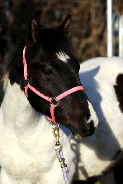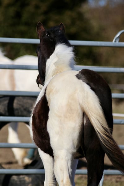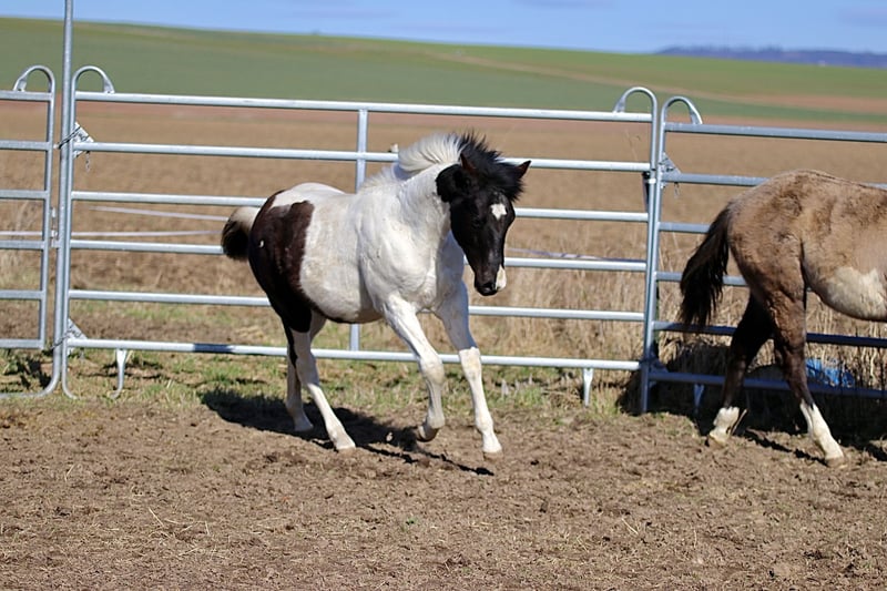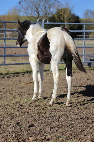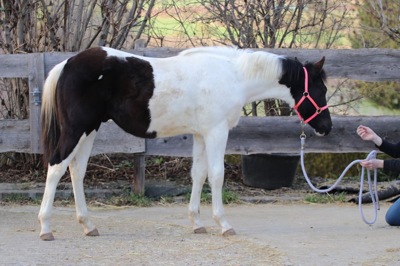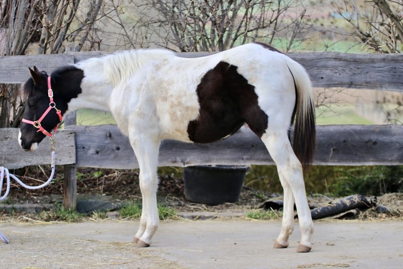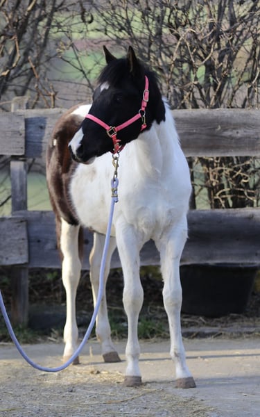 Raven est un poulain mâle câlin et docile. Il connaît déjà l'alphabet du poulain et apprend très rapidement. Il pourrait être homozygote pour le noir et le Tobiano, mais cela n’a pas encore été testé. Il connaît également le transport en remorque. Race : Paint Horse (papier APHA et passeport électronique du PHCG) Père : Rocky Mountain Music Mère : Cheyennes Candy Cane Né le 25/04/2025 Couleur : Noir Tobiano Taille adulte estimée : 155 cm Résultats génétiques : 5 Panel N/N, MYH1 N/N, OLWS N/N Je souhaite à Raven une famille de rêve où il pourra rester en pension adaptée à ses besoins. Préférence pour un élevage en paddock. Priorité à la qualité de vie plutôt qu’au prix !