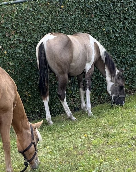 Ogier APHA, grullo Tobiano, homozygot czarny/tobiano (50% szans na dun-stripe) EE aa Dd TT. Panel 7 NN. Bardzo łagodny i przywiązany ogier, łatwy w obsłudze. Rodowód/paszport/zaszczepiony i odrobaczony itp. Cena 8500 €. W celu uzyskania dalszych informacji prosimy o kontakt telefoniczny pod numer +32/0483 39 02 03.