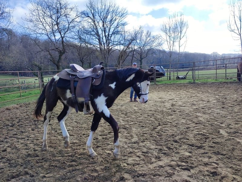 CD Namber Peppy Cat: Poulain Paint-Horse 2 ans Frame Ovéro/Black PP SIRE et US Panel 5 négatif par filiation et LWO/n car Frame Ovéro. Père Paint-Horse 2014 Spat NC Star Olena Black&White Ovéro 1.55m PP USA et SIRE, Mère Paint-Horse Haize Amber 2017 Sorrel 1.57m PP USA et SIRE. Le père et la mère sont visibles à l'élevage. C'est un gentil poulain, facile à manipuler, de tempérament calme et posé, proche de l'homme. Ce poulain sera grand(1.55/1.58), il a de belles allures, souples et aériennes. Nous le destinons à l’équitation de loisirs ou de compétition ainsi qu'à la reproduction. il peut faire un prospect Reining, Western Riding, Mountain Trail, All around et bétail: Team pening, Ranch Sorting... Nous devrions retrouver les qualités de son père qui est à la fois un très bon cheval de selle et un reproducteur de qualité. Sa mère,très bonne jument de selle all-around, bétail et d'extérieur, maintenant destinée à l'élevage. Il a été manipulé dès sa naissance suivant une méthode douce. Son travail est effectué par un professionnel. Son éducation est assurée suivant les méthodes de "Horsemanship"... Actuellement en Pré débourrage, il présente de très bonnes dispositions. Débourrage fin 2025... Contact par téléphone de préférence(laisser message)... Photos et vidéos disponibles.