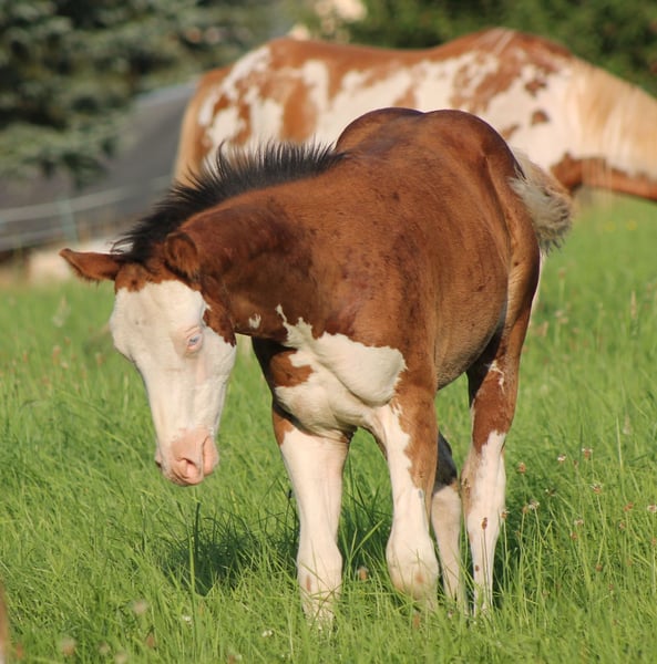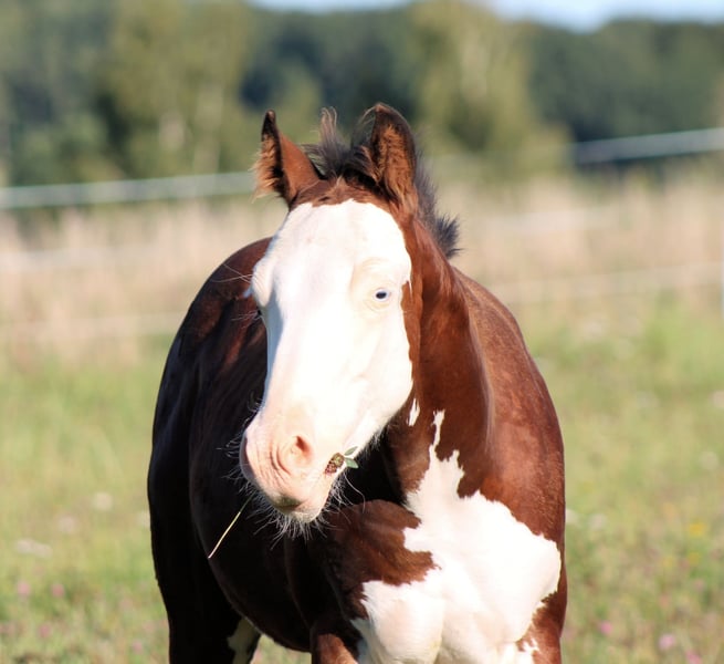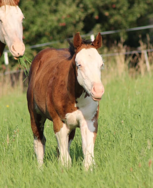 ELECTRIC SPOOK Paint Horse Hengstfohlen bay splash with blue eyes in besonderer Optik by CS ELECTRICSTARLIGHT ( Spooks Gotta Gun x Nu Chex Tu Cash ) Miss Chrome Gun by Smokin Gold Gun ( Gunner x Hollywood Dun It) Paco hat nicht nur ein besonderes Aussehen, auch sein Pedigree kann sich sehen lassen. Charakterlich ein absoluter Schatz, unerschrocken und sehr menschenbezogen. Kann ab Oktober als Absetzer ins neue Zuhause umziehen. Kennt bei Abgabe das Fohlen ABC und hat alles im Gepäck was er brauch. Wird mit APHA Papieren und E-Pass inkl. Zuchtbescheinigung abgegeben. Selbstverständlich wird er bis dato regelmäßig dem Hufschmied vorgestellt, gechipt, mehrfach entwurmt und geimpft. Paco wächst mit gleichaltrigen Pferden im Herdenverband auf. Die Mutter steht ebenfalls zum Verkauf. Wenn sie unsere Pferde kennenlernen möchten, können Sie sich gerne bei uns melden.