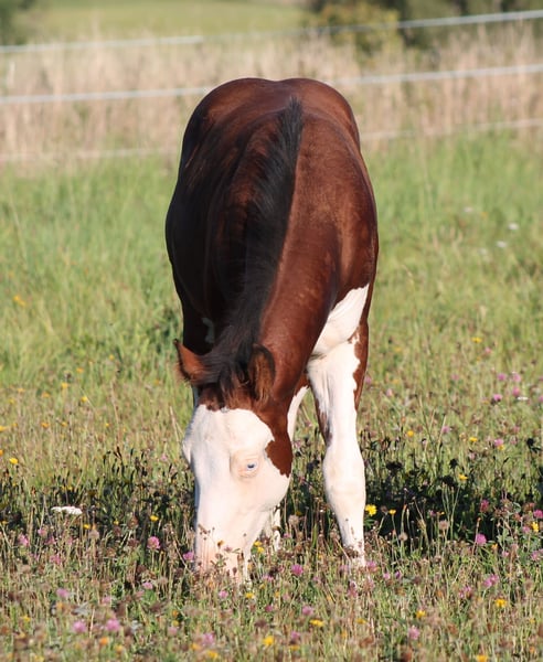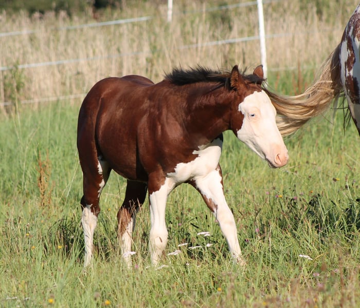 ELECTRIC SPOOK Paint Horse colt bay splash with blue eyes in a special appearance by CS ELECTRICSTARLIGHT (Spooks Gotta Gun x Nu Chex Tu Cash) Miss Chrome Gun by Smokin Gold Gun (Gunner x Hollywood Dun It) Paco not only has a unique appearance, but his pedigree is also impressive. Character-wise, he is an absolute treasure, fearless and very people-oriented. He can move to his new home as a weanling starting in October. By the time of transfer, he will know the basics of foal training and will come with everything he needs. He will be sold with APHA papers and an E-pass including a breeding certificate. Of course, he will be regularly presented to the farrier, microchipped, dewormed multiple times, and vaccinated until then. Paco is growing up with peers in a herd environment. The mother is also for sale. If you would like to get to know our horses, please feel free to contact us.