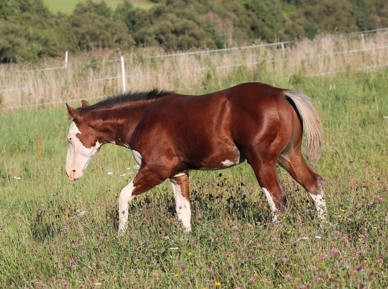 ELECTRIC SPOOK Źrebak ogier Paint Horse, kasztanowy splash z niebieskimi oczami o wyjątkowej urodzie, po CS ELECTRICSTARLIGHT ( Spooks Gotta Gun x Nu Chex Tu Cash ) Miss Chrome Gun po Smokin Gold Gun ( Gunner x Hollywood Dun It) Paco ma nie tylko wyjątkowy wygląd, ale także jego rodowód robi wrażenie. Charakter to prawdziwy skarb, nieustraszony i bardzo towarzyski. Może się przeprowadzić do nowego domu od października jako odsadek. Przy wydaniu zna podstawy dla źrebiąt i ma wszystko, co potrzebne. Będzie wydany z dokumentami APHA oraz E-pasem, w tym z certyfikatem hodowlanym. Oczywiście do tego czasu będzie regularnie pokazywany kowalowi, będzie miał czip, wielokrotnie odrobaczany i zaszczepiony. Paco dorasta w stadzie z rówieśnikami. Matka również jest na sprzedaż. Jeśli chcą Państwo poznać nasze konie, prosimy o kontakt.