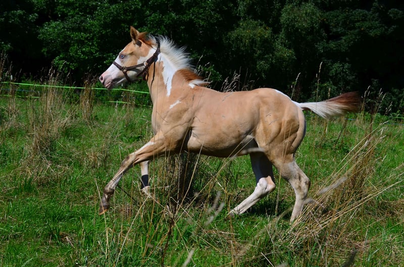 Jackson is homozygous for the Tobiano gene. He will always produce colorful foals. He has a bright blue eye. A brilliant pattern and great body! He is of course 7 Panel N/N. He is raised in a species-appropriate manner on large pastures in a big herd. He has papers from the APHA and a passport from the PHCG.