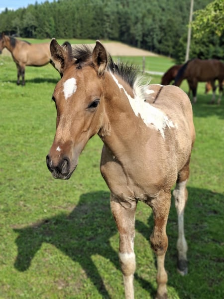 **Verkaufsanzeige: Paint Horse Hengst** Zum Verkauf steht ein wunderschöner Paint Horse Hengstabsetzer. Mit einem voraussichtlichen Endmaß von 158 cm und seiner auffälligen Farbgebung Dun Tobiano ist er ein echter Blickfang. Dieser Hengst ist bestens für den spätern Einsatz im Westernsport geeignet und zeigt bereits sehr vielversprechende Ansätze, auch für ein zukünftiges Zuchtpferd. Er hat ein freundliches und aufgeschlossenes Wesen, was ihn, verbunden mit einem sehr korrekten Gebäude und seiner erfolgversprechenden Abstammung zu einem idealen Partner im Turnier- sowie Freizeitbereich macht. Geschwister bereits erfolgreich geshowt! Er ist gut sozialisiert, wächst artgerecht auf und hat einen ausgeglichenen Charakter. Zudem ist er gesund, gechippt, hat volle Papiere und kennt bereits das Fohlen ABC. Wenn Sie auf der Suche nach einem talentierten und charmanten Pferd sind, das Ihnen viel Freude bereiten wird, dann ist dieser Paint Horse Hengst genau das Richtige für Sie! Bei Interesse oder für weitere Informationen kontaktieren Sie mich bitte.