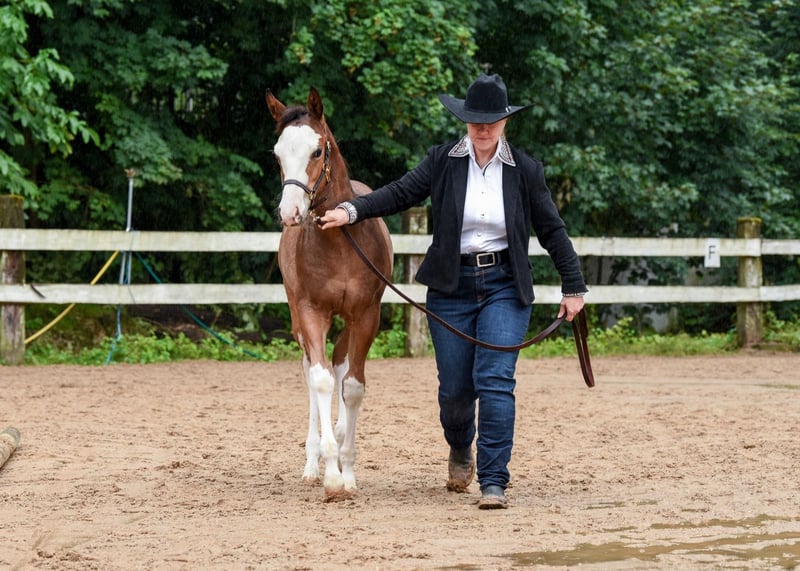 Outstanding colt born in April 2025, Bay with Overo pattern and a Jacke. Panel N/N. Best of Cowboy, affectionately known as "Franz," is a very friendly foal with an excellent pedigree and a solid, balanced build, impressing with his wonderful temperament. His dam is a daughter of the top sire RL Best of Sudden. She has achieved numerous successes in Western riding and is a true all-rounder. His sire, Original Cowboy, is a highly renowned stallion from the USA. He is now available for sale. Feel free to come and see this fantastic colt without obligation. www.paint-horse-ranch.de