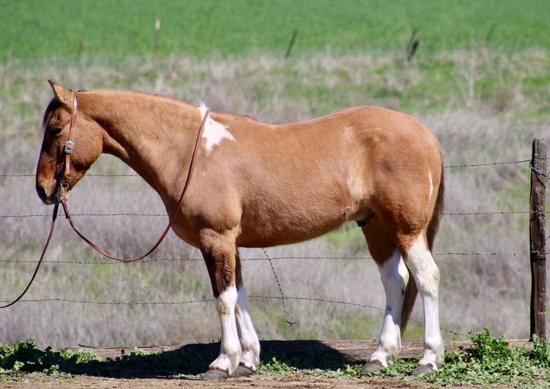 ONLINE AUCTION Place your bids at www.PlatinumEquineAuction.com Starting Bid $3500 Auction ends March 30th, 2025 Need a new saddle? Check out White Rock Saddles on our website or Facebook! Boogie is an eye catching, 14.2HH dun paint gelding at just 9 years old, he has many miles left to travel! Boogie is a certified ranch horse, he’s been out long miles looking for cattle, he will cross anything out on the trail, he has a great medium pace to him, and will travel the trails all day long. You can open and close gates from his back, sort cows, and do anything you need to. He has been branded off of and rope some outside too. boogie is most comfortable out in the countryside, doing a job for his rider! In the arena, he is very user friendly. He knows both leads, has smooth easy gaits, and a soft feel in the bridle. He carries his head collected. Moves off one handed direct rein, as well as leg pressure. He has impeccable ground manners, stands tied, good for farrier, bathing and will let you clip his face. He will load up into a two horse straight load, effortlessly. Boogie is an outstanding little horse, ready to continue his ranch work job, or he would be a great prospect to go into the rodeo world, I could see him being a great team roping, or breakaway horse! Boogie is located in Bitterwater, CA. for more info, or to schedule a visit with him, contact Cheyenne Rey 831-537-8746. ONLINE AUCTION Place your bids at www.PlatinumEquineAuction.com Starting Bid $3500 Auction ends March 30th, 2025 Need a new saddle? Check out White Rock Saddles on our website or Facebook!
