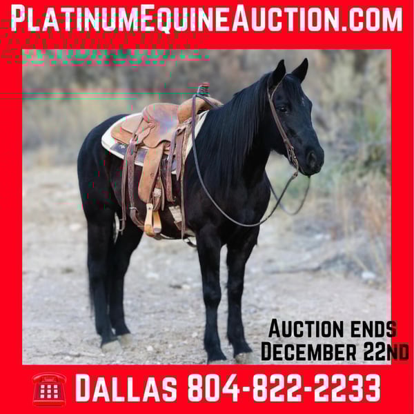 ONLINE AUCTION Place your bids at www.PlatinumEquineAuction.com Starting Bid $3500 Auction ends December 22nd, 2024 Need a new saddle? Check out White Rock Saddles on our website or Facebook! Jet is an 8 year grade gelding standing 14.2hh. This gelding is an absolute blast to ride no matter what job you give him! Whether you want to go pound rocks and rope wild cattle, venture through brush and rough terrain, mosey through town, or play around in the arena, Jet will give you his all and be enjoyable to ride! Jet has been dayworked on all over Arizona, from dragging calves to the fire to roping yearlings in the rough country, Jet will do it all! Not only is Jet great to use around the ranch and mosey down the trails, he’s an absolute blast to ride in the arena! He will walk, trot, and lope both ways with ease, as well as neck rein and has a good stop. Jet is good to groom, saddle, bathe, and shoe!! If you’re looking for a true all around gelding, Jet is your man! Transport can easily be arranged anywhere in the US!!! Located in Camp Verde, AZ. Contact D/C Equine Services Dallas 804-822-2233. ONLINE AUCTION Place your bids at www.PlatinumEquineAuction.com Starting Bid $3500 Auction ends December 22nd, 2024 Need a new saddle? Check out White Rock Saddles on our website or Facebook!