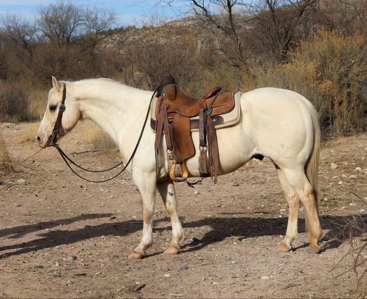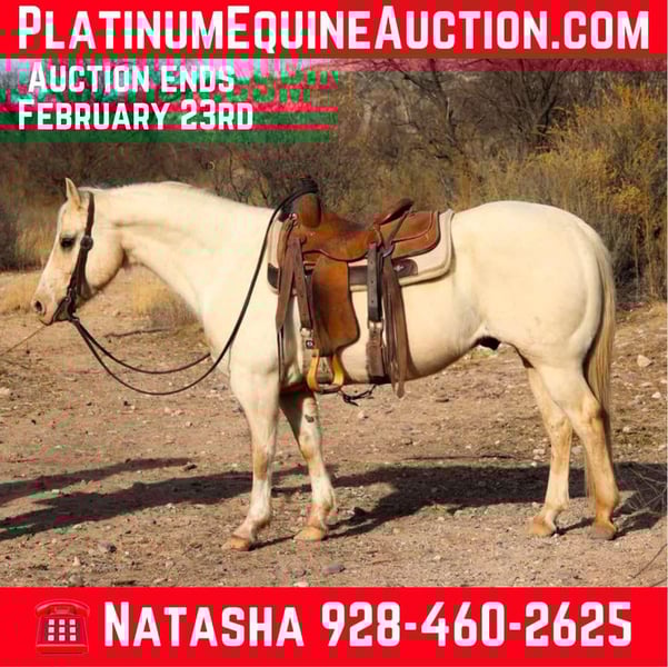 ONLINE AUCTION Place your bids at www.PlatinumEquineAuction.com Starting Bid $3500 Auction ends February 23rd, 2025 Need a new saddle? Check out White Rock Saddles on our website or Facebook! Andy is a grade 9 year old gelding standing 14.2hh. This stout made gelding has been used extensively on Arizona ranches and is an absolute blast to ride no matter your experience level. Andy is safe and gentle in absolutely every way possible! Whether you’re looking for your next mount to go do a long hard days work, cruise on through town, adventure down the trail, or play around in the arena, Andy is your man! Speeding traffic, flowing waters, rocky terrain, thick brush, you name it and Andy will cruise on by without blinking an eye! Not only is this gelding an absolute blast and surefooted as can be outside, he’s just as good in the arena!! Andy will walk, trot, and lope both ways with ease as well as neck rein, back up, and has a good stop! Andy is good to catch, groom, saddle, bridle, bathe, load, and shoe!! Will come with a clean coggins and health! Located in Camp Verde, AZ Contact D/C Equine Services Dallas 804-822-2233 or Natasha 928-460-2625. ONLINE AUCTION Place your bids at www.PlatinumEquineAuction.com Starting Bid $3500 Auction ends February 23rd, 2025 Need a new saddle? Check out White Rock Saddles on our website or Facebook!