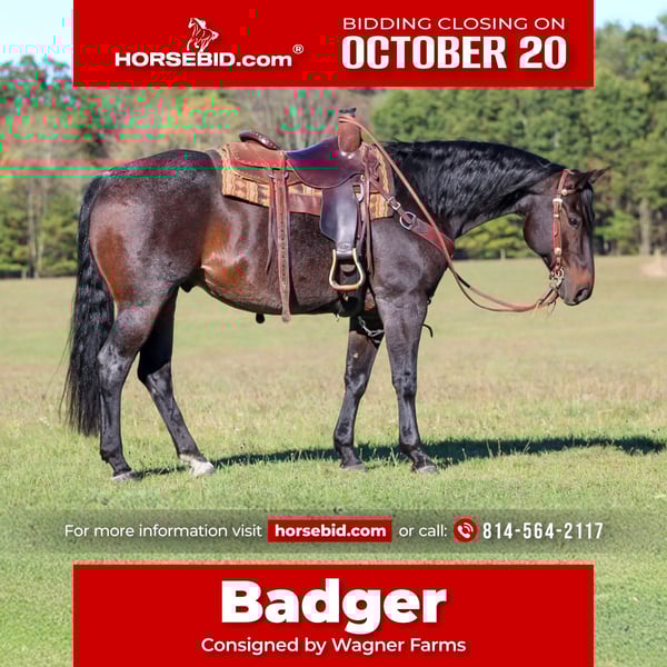 ♦️ 𝐭𝐡𝐞 𝐀𝐌𝐄𝐑𝐈𝐂𝐀𝐍 𝓕𝓪𝓵𝓵 𝓒𝓵𝓪𝓼𝓼𝓲𝓬 ♦️ Happening now thru MONDAY | OCTOBER 20th - Available EXCLUSIVELY on HorseBid's website! For more details and to register visit: www.Horsebid.com CONSIGNOR CONTACT: Wagner Farms 814-564-2117 LOCATION: Clarion, PA BREED: QH REGISTERED: Yes REGISTERED NAME: Badger COLOR: Bay Roan HEIGHT: 15 AGE: 9 GENDER: Gelding Badger is a 9 Year Old Bay Roan Registered Quarter Horse Gelding. Standing 15 hands tall and has a nice stocky built and is capable of carrying any size rider. Badger is a super broke all around gelding. He is capable of doing any job you ask him to and has a great work ethic and loves doing a job. He has done it all from trail riding, to ranch riding , to going to play day rodeos, running the barrels and the poles to just going out on a relaxing ride. Badger has literally done it all. He has a great handle and will ride one handed with a nice neck rein, side pass, good stop and back up and has a nice trot with a head set and a super smooth lope. I absolutely love this gelding. He has been one of my favorites that i have rode all summer. Loves attention and is easy to catch. Good for the farrier and vet. Gets along good with other horses turned out in the pasture. Super easy gelding . If you been in the market for that super broke all around gelding that be sure to checkout Badger!! Badger sells with no reserve to the highest bidder! Call or Text Glory at 814-564-2117 . We can help arrange delivery anywhere in the United States