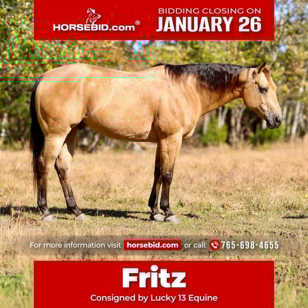 𝐉𝐀𝐍𝐔𝐀𝐑𝐘 ⭐️𝑨𝒍𝒍 𝑺𝒕𝒂𝒓 𝑳𝒊𝒏𝒆𝒖𝒑⭐️ Happening now thru MONDAY | JANUARY 26th - Available EXCLUSIVELY on HorseBid's website! For more details and to register visit: www.Horsebid.com CONSIGNOR CONTACT: Lucky 13 Equine 765-698-4655 LOCATION: Mount Vernon, KY BREED: AQHA REGISTERED: Yes REGISTERED NAME: Fritzerator COLOR: Buckskin HEIGHT: 15 AGE: 10 GENDER: Gelding Fritzerator aka Fritz is a 10-year-old registered buckskin gelding, standing 15 hands and built stout and solid. He’s the kind that catches your eye at the gate and earns his keep once you swing a leg over him. This gelding has paid his dues. Fritz has seen long days in feedyards and stockyards, pushing everything from emus and alpacas to Brahmas and Watusis. He’s been used to catch and load loose cattle and is the kind you want when things get western — sure-footed, gritty, and stays between you and trouble. He’s just not all business, Fritz is also fun and broke in the arena. He will walk, trot, and lope both ways, has a good stop and turnaround, and is very handy in the pasture. He side-passes to gates with ease and has been used extensively to pony and start colts, both on the trail and through cattle. Fritz would make an excellent ranch, or all-around using horse for someone looking for a good-minded gelding with real-world experience.