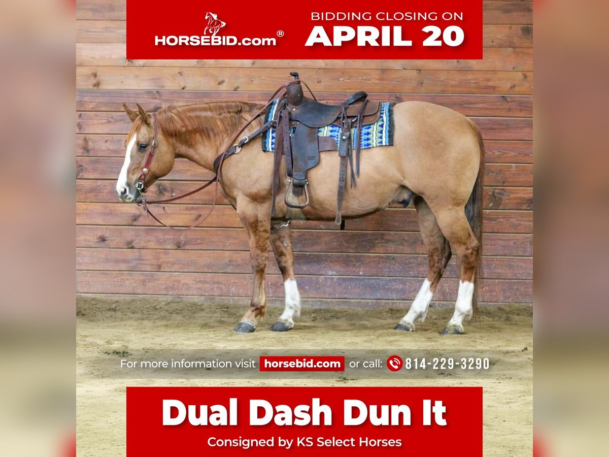 ⚜️𝐭𝐡𝐞 𝓔𝓵𝓲𝓽𝓮 𝐒𝐩𝐫𝐢𝐧𝐠 𝐂𝐥𝐚𝐬𝐬𝐢𝐜⚜️ Happening now thru MONDAY | APRIL 20th - Available EXCLUSIVELY on HorseBid's website! For more details and to register visit: www.Horsebid.com CONSIGNOR CONTACT: KS Select Horses 814-229-3290 LOCATION: Clarion, PA BREED: QH REGISTERED: Yes REGISTERED NAME: Dual Dash Dun It COLOR: Red Dun HEIGHT: 15 AGE: 10 GENDER: Gelding Dual Dash Dunn It is a Registered Quarter Horse Red Dun Gelding. Standing 15 hands tall and built like a old foundation quarter horse very stocky! Wow Check Him Out! He is sure to be a Highlight in anybody's barn. He has great blood lines and goes back to Hollywood Dunnit and Dual Pep on his papers. He is the whole package. He is super good looking, super safe to ride, well trained, prime aged, good blood lines and rides the very best. Whoever is the winning bidder with absolutely love him. Dual Dash Dunn It is a great family trail horse. Has been trail ridden all over and goes thru the mud , over the logs and rides in the creeks and water. Seasoned been there done that trail horse. He is beginner friendly and kid friendly. Super Gentle, Safe, and Quiet to Ride. Great one hand neck rein, Super nice smooth lope and side pass and good stop and backup. Very Well Trained but also Very Easy To Ride! He can do any job you ask him to on the ranch and is very good when it comes to working with cattle. Wether you want a horse to go out and do a job on or show or just a safe family horse Dual Dash Dunn It can go in any direction! He just recently on April 6th passed a lameness exam from North Fork Veterinary Clinic. Dont miss out on this opportunity to own such a Great Horse. We can help arrange delivery anywhere in the United States. Feel Free To Call or Text Kris at 814-229-3290. Thank You and God Bless