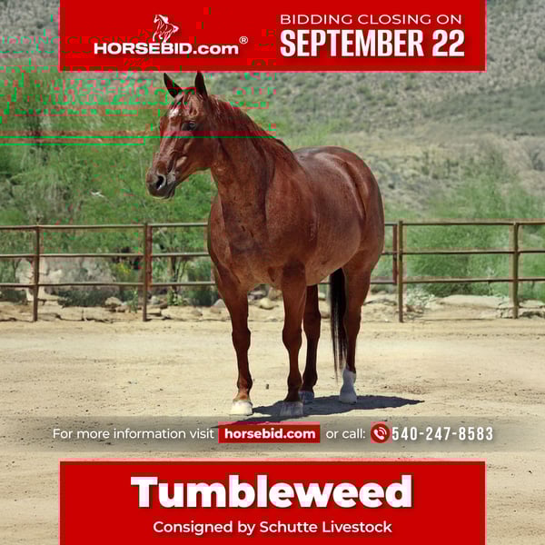 🍁𝒕𝒉𝒆 𝐅𝐀𝐋𝐋 𝑺𝒑𝒆𝒄𝒕𝒂𝒄𝒖𝒍𝒂𝒓🍁 Happening now thru MONDAY | SEPTEMBER 22nd - Available EXCLUSIVELY on HorseBid's website! For more details and to register visit: www.Horsebid.com CONSIGNOR CONTACT: Schutte Livestock 540-247-8583 LOCATION: Front Royal, VA BREED: Quarterhorse REGISTERED: Yes REGISTERED NAME: R Two Starlite COLOR: Red Roan HEIGHT: 15 AGE: 9 GENDER: Gelding R Two Starlite, described as “the ultimate ranch horse” by Sarah and Mozaun McKibben and from whom I purchased the horse three months ago, is being offered for sale again. In the slightly over three months I have owned him, Starlite has only been ridden approximately 10 times; this horse deserves and needs to be ridden. Not a horse for beginners and sometimes tense when first mounted. The following description, pictures and video by the McKibbens demonstrate the diverse ability of this outstanding horse. “Cowboy looking, red roan, and built to last a lifetime. Tumbleweed is the ultimate ranch horse and the most trusty partner headed down the trails and through the mountains. This sweet natured gelding has seen lots of country and been a top hand on our TX ranch as well as AZ. Tumbleweed goes right through water, mud, brush, rocky terrain and prickly cactus. He walks on a loose rein and is confident alone or in a group. Busy traffic, heavy machinery, and loud commotion do not faze him. He’s accustomed to crazy dogs, buffalo, pigs, wildlife and even a camel. Tumbleweed ropes both ends in the team roping. He’s quiet in the box, rates cattle good, and knows his job. He’s been roped on in the pasture as well, will work the rope and can hold anything dallied to his saddle horn. Tumbleweed has been ridden English and bareback too. He collects nicely, has good lead departures, will jump over obstacles and side pass to open and shut any gate. He has a one handed neck rein and will steer right where you send him. Tumbleweed is easy to catch, good turned out with other horses, and easy to have around the barn. He has great ground manners and is always a gentleman. Tumbleweed is fancy enough for the ranch boss, handy for a day working cowboy, honest for weekend roper or solid for someone just wanting a really nice pleasure horse. He is the same trip every time and doesn’t need daily riding to stay trained. Tumbleweed will lay down with a touch of the finger and let you get right on. He’s a simple, fun, and easy horse to own. He’s conformationally correct, balanced, and sound in every way. He’s utd on vaccines, worming, and shoeing. …”