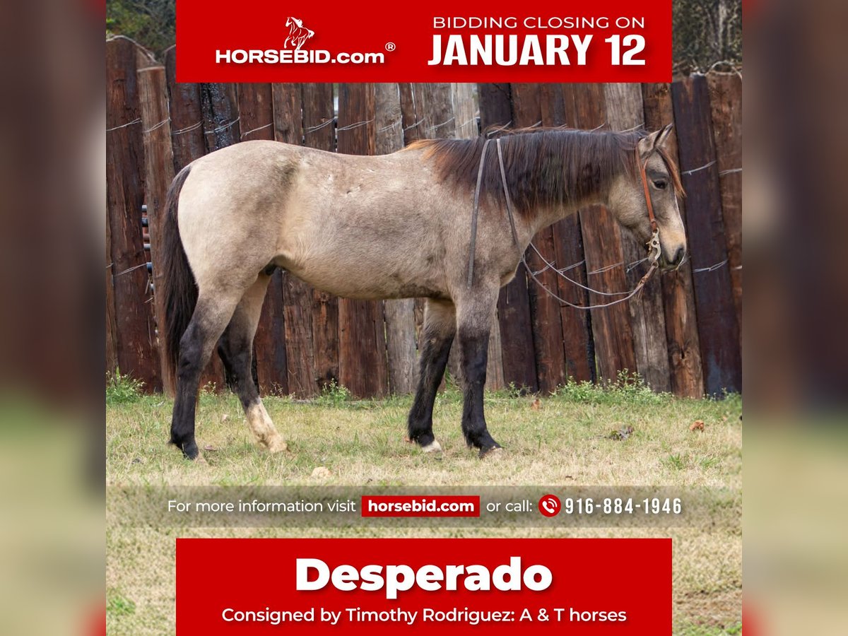 ♦️𝐍𝐄𝐖 𝐘𝐄𝐀𝐑'𝐒 𝑬𝒙𝒕𝒓𝒂𝒗𝒂𝒈𝒂𝒏𝒛𝒂♦️ Happening now thru MONDAY | JANUARY 12th - Available EXCLUSIVELY on HorseBid's website! For more details and to register visit: www.Horsebid.com CONSIGNOR CONTACT: Timothy Rodriguez: A & T Horses 916-884-1946 LOCATION: Palmer, TX BREED: Qh REGISTERED: No REGISTERED NAME: Desperado COLOR: Buckskin HEIGHT: 15.1 AGE: 10 GENDER: Gelding Meet our incredible 10yr old buckskin gelding named Desperado. Standing at 15,1 hands, he’s built to last with lots of bone and a huge heart that’ll go all day long for you! This versatile and extremely athletic horse has done it all: ✅Ranch Work ✅Trail Riding ✅Traffic safe ✅Not Spooky Whether you need a reliable partner for ranch chores or a steady companion for trail adventures, he’s your guy. Desperado will cross anything you ask him to. He has no spookiness to him and has taken everything we’ve thrown at him in stride! We’ve taken him to town and he isn’t rattled by the cars, Christmas lights, or local joggers! He just keeps a cool calm attitude. Coming off a huge ranch in AZ he’s known for being super athletic in the sorting pen. He gets any job done, weather it be gathering, sorting or doctoring pairs he’s a saint with it all! Desperado is extremely cowy and alot of fun. His experience and athleticism make him a perfect fit for any rider that is looking for a dependable and hardworking horse. Desperado one of a kind to ride and look at! He neck reins nicely and carries himself with such grace, I can’t help but think he would great as an English horse! Desperado is easy to catch, blanket, bathe and hauls like a dream! He will back out or turn around in any trailer! This a sweet gelding with a kind eye that aims to please 365 days a year! Folks don’t miss out! He’s sound with zero maintenance, his kind are hard to find!