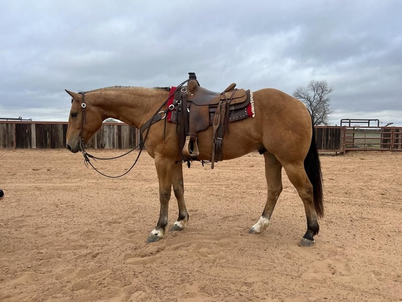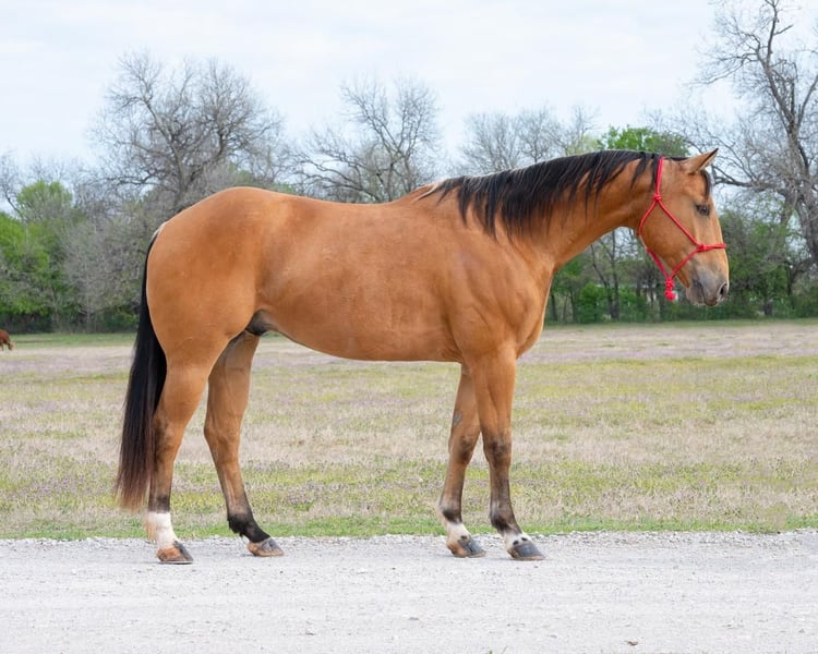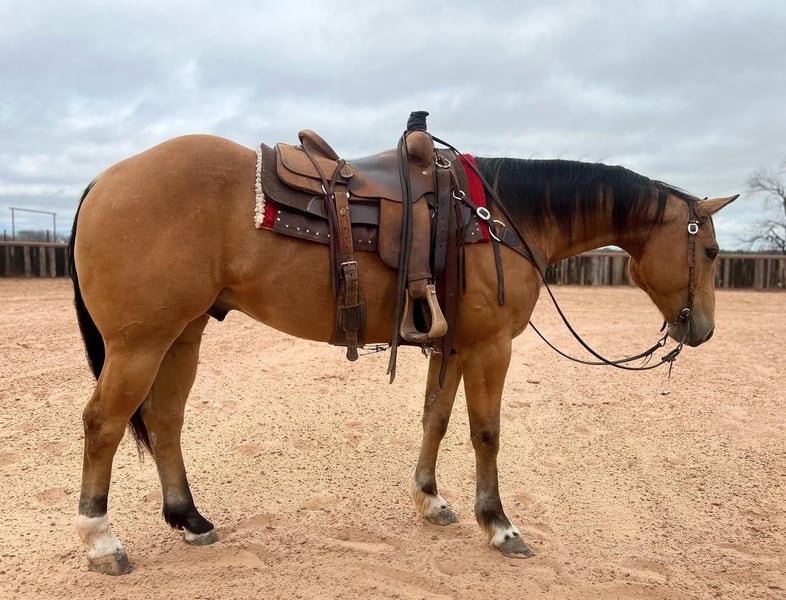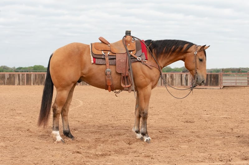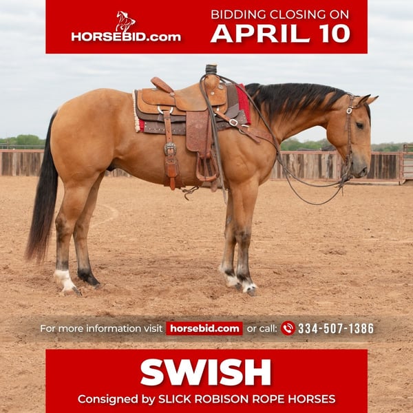 SPRING Extravaganza Happening now thru MONDAY | APRIL 10 - Available EXCLUSIVELY on HorseBid's website! For more details and to register visit: www.HorseBid.com CONSIGNOR CONTACT: SLICK ROBISON ROPE HORSES 334-507-1386 LOCATION: Weatherford, TX BREED: AQHA REGISTERED: Yes REGISTERED NAME: SONNYS FANCY BUCK JF COLOR: BUCKSKIN HEIGHT: 15.1 AGE: 7 GENDER: Gelding Swish is a very easy horse to have around. He is easy to catch and always up for a job. He is 15.1, a rich buckskin color and built to last. He has good feet, stout conformation and is built on great bone. There is no buck, no spook, no funny business with Swish. He will go wherever you point him, will walk on a loose rein, and has the stamina to go all day and will cover lots of country. He has a smooth, flat trot and a pretty lope. He's a great horse to have on the ranch horse and fun out on the trails. LOCATION Weatherford, TX