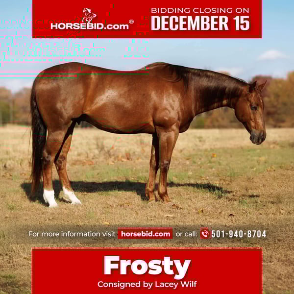 🎄𝐓𝐇𝐄 𝑯𝒐𝒍𝒊𝒅𝒂𝒚 𝐂𝐋𝐀𝐒𝐒𝐈𝐂🎄 Happening now thru MONDAY | DECEMBER 15th - Available EXCLUSIVELY on HorseBid's website! For more details and to register visit: www.Horsebid.com CONSIGNOR CONTACT: Lacey Wilf 501-940-8704 LOCATION: Quitman, AR BREED: Quarter Horse REGISTERED: Yes REGISTERED NAME: GG Streaking Frosty COLOR: Sorrel HEIGHT: 15.1 AGE: 9 GENDER: Gelding Graceful, athletic, and remarkably well-rounded, Frosty is the horse that checks every box for riders who appreciate refinement, reliability, and real-world usefulness. A finished barrel horse with the kind of effortless drive and natural quickness that make him competitive, he pairs his run with a calm, agreeable mind—never hot, never frazzled, and always willing to stay right with his rider. He hauls to town, handles traffic, bicycles, dogs, and noise with confidence, and he settles into new environments like he’s been there for years. Frosty is built beautifully: balanced over his topline, straight and correct in his limbs, and shapey in all the right places. His movement is even more impressive—long, fluid, and expressive enough to catch your eye in English tack and enough power to sit down and drive in Western work. He carries himself naturally in frame, stays soft in the poll, and is exceptionally broke through the bridle and ribcage, giving you a horse that feels both polished and effortless to ride. An obstacle-savvy partner, Frosty crosses bridges, logs, water, brush, and busy ground with a confidence that makes him a pleasure on any trail. He rides out alone or in a group, and he stays level-headed and sure-footed in all types of terrain. His personality is equally impressive—sweet, social, and people-oriented. He’s the first to greet you at the gate, always friendly in the barn, and an easy keeper in every sense. Frosty carries a pedigree loaded with run and reputation, being a grandson of the legendary Sun Frost through PC Lock N Frost, and out of a mare by Streakin Days, a son of the great Streakin Six. His bloodlines blend iconic cow sense with proven speed, giving him the kind of genetic foundation that excels in any performance direction. His pedigree brings the run, the grit, and the athleticism that barrel racers want, but his build and handle open doors far beyond one lane. Frosty has the structure, mind, and responsiveness to make an exceptional rope-horse prospect as well—strong enough to hold one, quick-footed enough to excel, and broke enough to transition with ease. On the ground, Frosty is pure professionalism. He stands quietly to saddle, bridle, bathe, clip, load, and shoe. He ties without fuss, leads respectfully, and handles daily routines like a seasoned veteran. Whether you’re warming up at a show, navigating a busy parking lot, or saddling in the dark before a morning ride, he stays steady, mannerly, and unfazed. Frosty is the definition of a complete horse—finished, versatile, beautifully made, and genuinely enjoyable. Elegant enough for the show pen, steady enough for the trail, and talented enough for the arena, he is a rare, high-quality gelding ready to elevate any program!