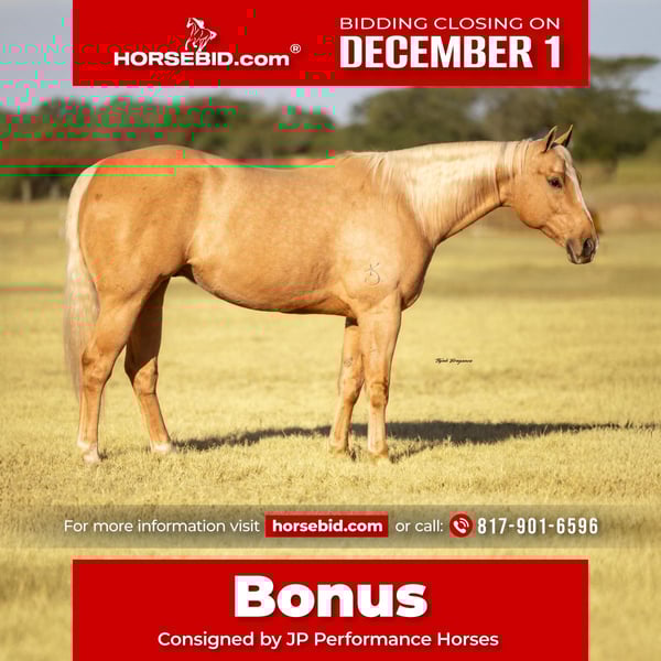 ⚜️ 𝓽𝓱𝓮 𝐇𝐨𝐫𝐬𝐞𝐦𝐚𝐧'𝐬 𝓢𝓱𝓸𝔀𝓬𝓪𝓼𝓮⚜️ Happening now thru MONDAY | DECEMBER 1st - Available EXCLUSIVELY on HorseBid's website! For more details and to register visit: www.Horsebid.com CONSIGNOR CONTACT: JP Performance Horses 817-901-6596 LOCATION: Weatherford, TX BREED: Quarter Horse REGISTERED: Yes REGISTERED NAME: DE Gold Dragon COLOR: Palomino HEIGHT: 15.2 AGE: 9 GENDER: Gelding Bonus is the ultimate family horse—an exceptional blend of beauty, personality, and dependable talent. He’s truly been there and done that, making him the kind of partner everyone hopes to find. Quiet, confident, and endlessly willing, Bonus is ready to step into his next home and give someone an incredible, trustworthy partner for years to come. Bonus is the first to meet you at the gate, love shining in his eyes, and he’s always eager for your attention. His striking looks make him standout anywhere we go. Bonus has been there done that. He thrives in any adventure or task you ask of him. Whether it’s crossing water, navigating traffic, riding English, Hunt Seat, jumping, working cows or heading out on long trail rides, Playdays, Bonus takes it all in stride. We have been jumping him, which he loves, and is up to 2ft and handling with ease. He’s calm, confident, and not spooky. Safe for any level rider. Picks up his leads super easy, has a nice spin, neck reins with one finger and has a nice stop. He could be shown in AQHA ranch trail, ranch versatility, jumping, Hunt Seat, 4H shows, the sky is the limit with this beautiful gelding. He loads and unloads easily, stands quietly for the farrier, and even enjoys bath time! Bonus is extremely versatile whether your riding western or English, he handles everything we have thrown at him like an old veteran. He would make an excellent therapy horse with his sweet nature. Whether you ride him every day or leave him off for a few weeks, he always picks up right where you left off. Absolutely NOTHING bothers him. The list is endless as to what he would do! This gelding is a true family-friendly horse—gentle, laid-back, and absolutely full of heart. His soft expression and kind demeanor say it all: he’s just like a big puppy dog. • Age: 9 years old • Coggins: Current • Teeth floated: November 2025 • Temperament: Exceptionally sweet and easygoing • 15.2 hands tall If you’re looking for that once-in-a-lifetime horse that’s safe, reliable, and loaded with personality—Bonus is it. 📞 For more information or to schedule a visit or FaceTime call, contact Jackie with JP Performance Horses at (817) 901-6596. Shipping can be arranged anywhere.