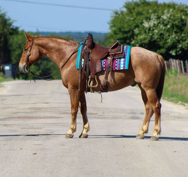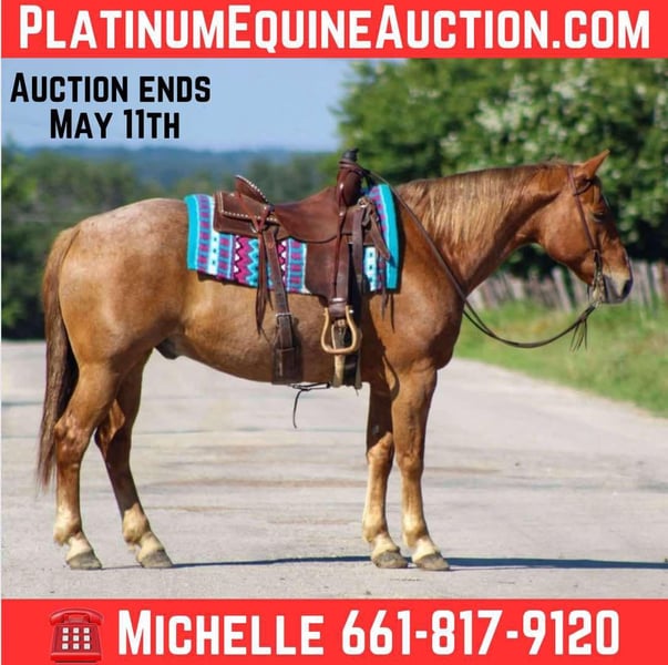 ONLINE AUCTION Place your bids at www.PlatinumEquineAuction.com Starting Bid $3500 Auction ends May 11th, 2025 Need a new saddle? Check out White Rock Saddles on our website or Facebook! Meet Pedro, a truly classy roan gelding that’s sure to steal your heart! At 10 years old and standing a perfect 15 hands tall, he boasts an old-school build—stout, big-boned, and with solid, sturdy feet. This handsome guy has experienced a little bit of everything, making him well-rounded and versatile. In the arena, Pedro has a smooth walk,trot and lope in perfect circles. He has a fantastic stop; just sit down and say “whoa,” and he’ll come to a smooth stop. He has a great neck rein on him, moves off your legs and backs up when asked. When it comes to hitting the trails, Pedro is an absolute blast! We’ve taken him on countless adventures through Texas state parks, and he’s proven to be reliable on diverse terrains. He confidently navigates hills, crosses water, logs, and bridges, and even makes his way through thick brush. Whether you prefer to ride in a group or solo, Pedro is happy with either. He’s been ridden right from the house along busy highways, so traffic doesn’t faze him at all. For more info contact M $ Performance Horses Michelle 661-817-9120. Located in Stephenville, TX. ONLINE AUCTION Place your bids at www.PlatinumEquineAuction.com Starting Bid $3500 Auction ends May 11th, 2025 Need a new saddle? Check out White Rock Saddles on our website or Facebook!