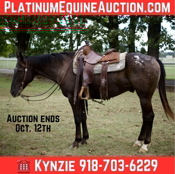 ONLINE AUCTION Place your bids at www.PlatinumEquineAuction.com Starting Bid $3500 Auction ends October 12th, 2025 Need a new saddle? Check out White Rock Saddles on our website or Facebook Applejack will fit your program! Applejack is a 15.1h, 10 year old appaloosa gelding. He is so broke and handy! He will ride english or western, so light in the face, has a rocking chair lope, and a very good horse to have in anyone’s program! If you want one to take down the trails, goes through the water, over the logs and through the ditches with no issues, he is the one! He has been used all over the ranch to doctor, sort, and drug calves to the fire. AppleJack is one hand broke, lopes circles in the arena, picks up both leads, has a nice stop, and goes wherever you ask him to go with no hesitation! He is very very gentle to be around, good to saddle, bridle, and groom! AppleJack loads great, hauls well, easy to bathe, and just a great horse to be around! We think just about anyone could get along with him and he’d be great for any level! He is clean legged, and absolutely sane and sound in every way! Vet checks are welcome! We will help you arrange shipping anywhere, and would love to answer any other questions you may have! FMI call TG Livestock Co. Kynzie- 918-703-6229 Located in Sallisaw, OK. ONLINE AUCTION Place your bids at www.PlatinumEquineAuction.com Starting Bid $3500 Auction ends October 12th, 2025 Need a new saddle? Check out White Rock Saddles on our website or Facebook