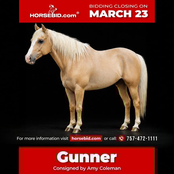 ⚜️𝓽𝓱𝓮 𝐆𝐎𝐋𝐃 𝓢𝓮𝓵𝓮𝓬𝓽⚜️ Happening now thru MONDAY | MARCH 23rd - Available EXCLUSIVELY on HorseBid's website! For more details and to register visit: www.Horsebid.com CONSIGNOR CONTACT: Amy Coleman 757-472-1111 757-472-1111 LOCATION: Barhamsville VA BREED: Quarter Horse REGISTERED: No COLOR: Palomino HEIGHT: 15.2 AGE: 11 GENDER: Gelding Gunner is an 11 year old gelding backed by bloodlines known for sense, athleticism and longevity. Produced in Stuart, Nebraska with a solid foundation. He is a true gentleman with endless patience. He’s the kind of horse that doesn’t mind if you want a quiet stroll or to go have a blast. He is safe, willing and doesn’t complain. Easy to catch, impeccable ground manners, simple for anyone, no bad habits, no maintenance, a wonderful easy keeper and consistent day after day. Gunner is attentive, surefooted and dependable on the trail. He has the versatility to be your ranch partner, rope cattle, or step in the arena and try something different, he’s has been ridden by all levels of riders.
