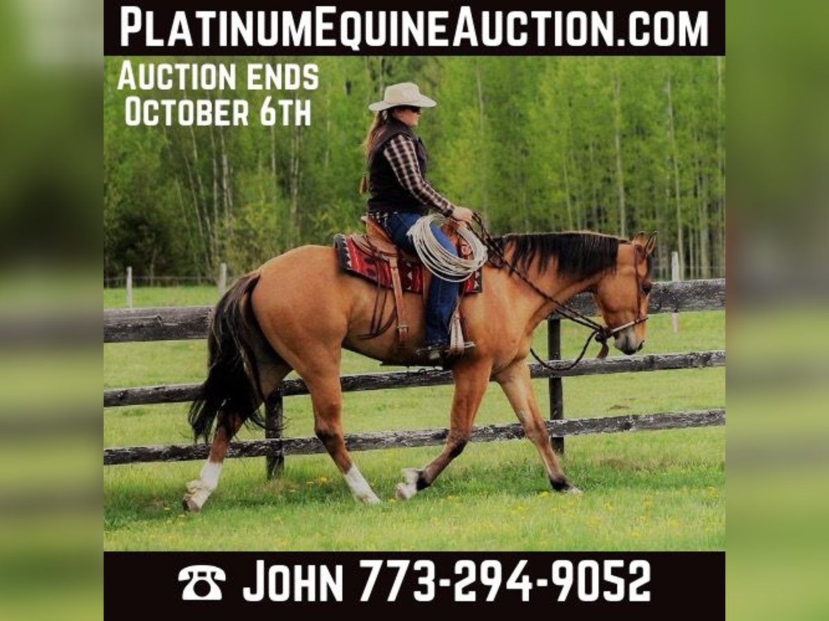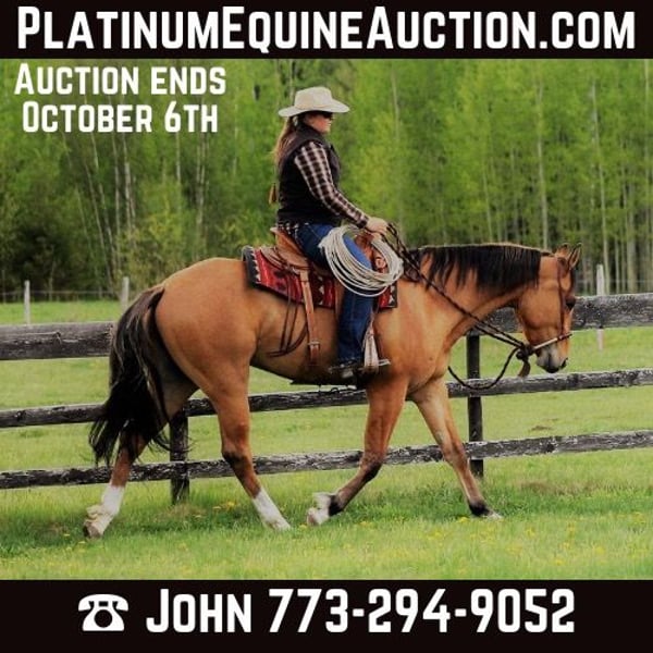 ONLINE AUCTION Place your bids at www.PlatinumEquineAuction.com Starting Bid $3500 Auction ends October 6th, 2024 Need a new saddle? Check out White Rock Saddles on our website or Facebook! We are proud to present “Starbuck” a 9-year-old (2015) 16.1hh stunning buckskin gelding Appendix Quarter Horse. In 2023 Starbuck was 3rd in the Ohio Hunter Jumper Association (OHJA) Future Hunter Division. Starbuck excels at Western riding. He has been used on a ranch in British Columbia, Canada. He has sorted cows with a rope thrown off him and caught smaller calves in the pasture. He has been ridden on trails, the arena and in the field with adult amateur and junior riders. He can be ridden bridleless and has been ridden bareback with a 9-year-old junior rider. Starbuck is easy to handle and has excellent ground manners with no bite, buck, bolt or kick. Starbuck has a beautiful walk, a floaty trot, and a rhythmical canter. He moves on and off seat with light to medium pressure, knows lateral movements and is soft thru the pole. He responds very well to aids. His conformation and pedigree would also lend nicely to Dressage. When you add his color to his athletic abilities, you will surely be turning heads, whether out on the trails, on a ranch or in the show ring. Starbuck pokes his nose and pops his ears right up when approaching his stall, and he seeks affection from his human companions and he loves children. Out in the field, he is easy to catch. He loads and unloads for trailering best with a box or a slant stall. He stands for hoof picking and farrier without concern. Starbuck is microchipped and has a lifetime USEF membership, ensuring his identity and eligibility for competitions. Starbuck is a smart, sensible young horse in his prime with a bright future due to his extensive professional training. He would be best fit and excel at trail riding, Dressage, Western or as a ranch horse. It’s not every day you find a horse with this pedigree, versatility, professional training, mind, and disposition. He is ready to find his next companion and home. Enjoy the accompanying video and images showcasing his exceptional abilities with various riders and terrain. The videos and images speak for themselves. For questions, please call John Keating 773-294-9052 Located in Goshen, OH. ONLINE AUCTION Place your bids at www.PlatinumEquineAuction.com Starting Bid $3500 Auction ends October 6th, 2024 Need a new saddle? Check out White Rock Saddles on our website or Facebook!