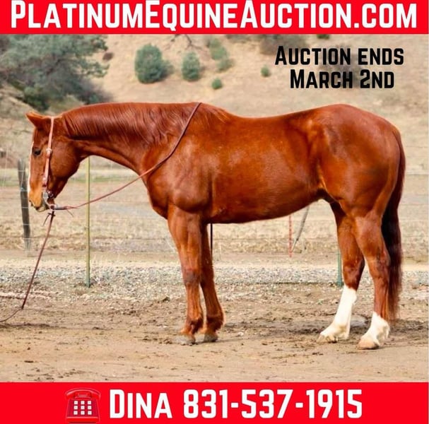 ONLINE AUCTION Place your bids at www.PlatinumEquineAuction.com Starting Bid $3500 Auction ends March 2nd, 2025 Need a new saddle? Check out White Rock Saddles on our website or Facebook! Ace, I’m about to introduce you to the platinum of horses—top-notch and exceptional in every way! Ace is a 10-year-old, solid, 15.1-hand beautiful gelding. This horse is the definition of versatility; he is as safe and reliable as you will ever find. Not only is he broke, broke, broke, but he is also safe enough for any level rider. He is friendly, meets you at the gate, and puts his head in the halter. He will be a leisurely trail companion or a competitive ranch horse, show horse, obstacle master, or just the best horse you have ever ridden. Ace has been shown not only in ranch versatility but also in ranch horse classes, and he is as solid as you can get. He will ride like a Reiner—collected, soft, and supple. He will slide to a stop with just the shift of your seat in the saddle, will turn around on a loose rein, and back up with the touch of your heels. He will do nice and easy flying lead changes. This horse is amazing! Ace is a top-notch ranch horse that has branded, sorted, and doctored many cattle. He will hold one for you to doctor. He watches a cow and works one in and out of the arena. He has been started on the head side and would make a jam up head horse! Ace is a superstar out on any trail, where he will walk calmly and safely anywhere you want to go, be it the top of the mountain or cruising the trails. He’s done it all; he will cross switchbacks, narrow paths, overgrown landscapes, and cross the deepest water. If obstacles are your thing, this horse has been over, through, and around everything you can imagine, and he will do it bridleless. Slow, low-headed bridges, tires, flags, tarps, and bouncy balls are no match for this seasoned veteran. He has been ridden down busy streets with zero issues. He is just the most talented horse we have ever offered. Ace is a doll to be around, tacks up like a dream, stands great for the farrier, and hauls well. He stalls well and has also been out in a herd environment and does great. If you want a horse with the WOW factor, Ace is the guy for you. He will be the star of the show or make everyone jealous with his calm, trusting nature. Don’t hesitate to contact Dina at 831-537-1915 to come meet Ace at Longhorn Ranch, located in Paicines, CA. ONLINE AUCTION Place your bids at www.PlatinumEquineAuction.com Starting Bid $3500 Auction ends March 2nd, 2025 Need a new saddle? Check out White Rock Saddles on our website or Facebook!