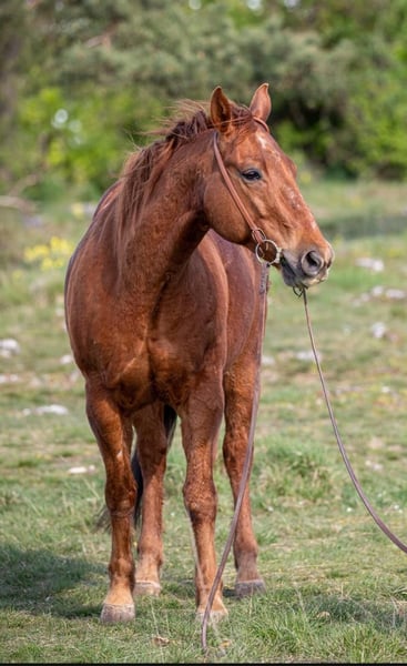 Quarter Horse, Gelding - 12 years old (born 2014) - Chestnut - Excellent basic Western training (cutting bloodlines) - Very gentle, calm, willing to work, and reliable - Diagnosed with ringbone and osteoarthritis in the front legs since 2021 Cutter has been ridden for leisure in Western style, both in arena and trail riding, since 2021. His solid basic training and willingness to work make both disciplines very enjoyable for him. He is also familiar with being led as a ground partner in the terrain. He knows trailering and loading well, entering without issues, and is very uncomplicated and cool in unfamiliar environments, reflecting his entire character. He is also friendly and calm around children. Due to his medical findings, he usually does not move perfectly straight at walk. He moves well in trot and canter. Regular, consistent exercise benefits him, but cutting is definitely no longer suitable for him. He has been barefoot for a long time; since his diagnosis, he has been shod with front shoes until summer 2025. Since summer 2025, he has been gradually transitioned back to barefoot, and he is adjusting well over time. In the terrain, he needs hoof boots front and back and prefers softer footing. I am looking for a wonderful pasture-based stallion placement for Cutter, where he can have a purpose beyond sport, in accordance with his health issues, and where his lovely character is appreciated. He is a horse that enjoys being active and participates happily in riding and groundwork. Price excludes accessories. These can be included at an additional cost (Western saddle, hoof boots, blankets, etc.).