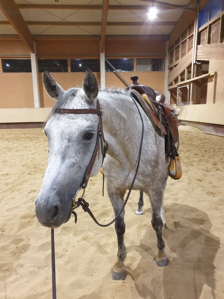 Wallach, geboren: 2014, Stockmaß: 155 cm, Schimmel, QuarterMix Charakter: sehr ruhig, unerschrocken und unglaublich verschmust, sehr, sehr menschenorientiert. Er liebt • die Bodenarbeit, Spaziergänge, Geländeritte Ausgezeichneter Ausbildungsstand, sehr vielseitig gearbeitet, Western geritten, kennt auch die englische Reitweise. Hat eine Grundausbildung in der Reining, hat Reiter schon zum WRC gebracht. Er wurde sehr vielseitig ausgebildet, uns war es immer wichtig, dass er viel kennt. Ebenfalls kennt auch den Trail sowie Gymnastiksprünge. Beherrscht beim Reiten unter anderem • Seitwärts, 2 er Galoppwechsel, Ansätze zur Piaffe Unter dem Sattel ist er auf dem Platz/ in der Reithalle ein gemütliches Pferd. Er wurde immer, egal ob bei Longenarbeit oder vor dem Reiten, gut aufgewärmt. Im Gelände ist er sehr, sehr gerne, er geht gerne hinaus und erlebt etwas. Keine Angst vor Kühen, Autos, LKW, Tieren, Wind, Sturm, Fahrrädern… ect. Bodenarbeit: Kennt Seitwärts von mir weg bzw. auf mich zu, Hinterhand weg/ zudrehen, freies longieren als großer bzw. kleiner Zirkel um einen herum, spanischer Schritt, ablegen auf Kommando… Gesundheit: PSSM Test negativ, hatte nie Kolik oder ähnliches; Kein Koppen, Weben etc. Er hat ein Schimmelmelanom am Hals. Schmiede und verladefromm, kennt sowohl Barhuf als auch Beschlag. Läuft ebenfalls brav in der Führanlage. Er steht in einer Paddockbox; kennt von uns nur 24 Stunden Heu- Fütterung. Er sucht ein neues Zuhause, in dem er freizeitlich gearbeitet wird. Bei Fragen einfach melden (via WhatsApp oder einfach Anrufen😊). Weiteres Kennenlernen gerne möglich:)