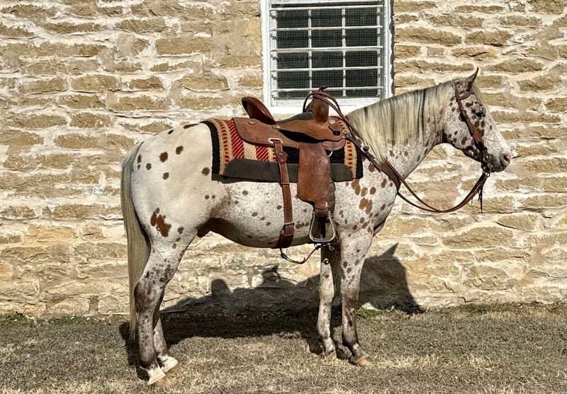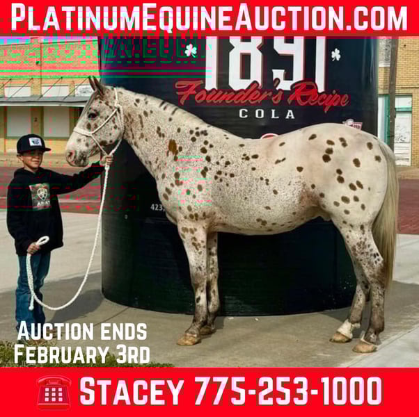 ONLINE AUCTION Place your bids at www.PlatinumEquineAuction.com Starting Bid $3500 Auction ends February 3rd, 2025 Need a new saddle? Check out White Rock Saddles on our website or Facebook! Applejack is his name, and being a friendly family horse is his game! This leopard Appaloosa is one of a kind. He stands 14 hands and is 12 years old. Applejack has been packed on, gathered cattle in the rugged mountain terrain, and pulled buggies on the ranch and into town. He has been trail ridden out alone and in large groups of horses and it doesn’t matter to him if he is in the front or back of the pack. We have had some fun on him dragging the kiddos on sleds through the mud and water. Applejack is as friendly as they get, whenever you walk in the barn and always nickers to greet you. When you walk in his pen, he comes over and wants to hangout and see what you’re doing. He loves to get scratches from the kids and adults. Easy to blanket and wears a size 72, loads and unloads from the trailer with ease. He has no bad stall habits, keeps his stall orderly and is an easy keeper. Applejack is very stout made for his height, which makes him a great asset to the youth and adult riders as well. He has been ridden just about everywhere you can ride one. Applejack doesn’t have all the fancy reining maneuvers, he isn’t a cutting horse with a big stop and quick movements, BUT he always wants to please and go down the trails so you can enjoy your time with him. Watch his video and you will see he is a jack of all trades! Best thing about him is you can always show him something new and he just goes along with it and stays calm. This is a flashy gelding that will get attention anywhere he goes, and you’ll be happy to have him in your barn every day! Contact Red Lock Ranch 775-253-1000 Located in Dublin, TX. ONLINE AUCTION Place your bids at www.PlatinumEquineAuction.com Starting Bid $3500 Auction ends February 3rd, 2025 Need a new saddle? Check out White Rock Saddles on our website or Facebook!