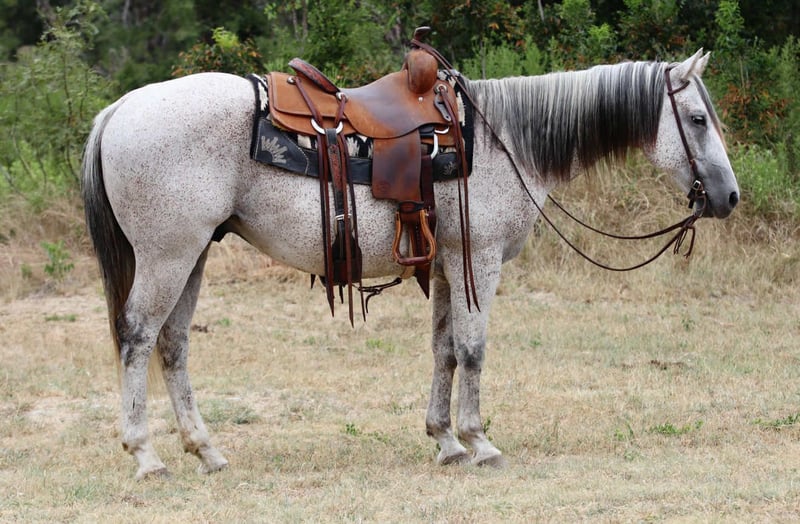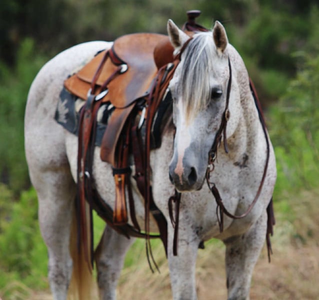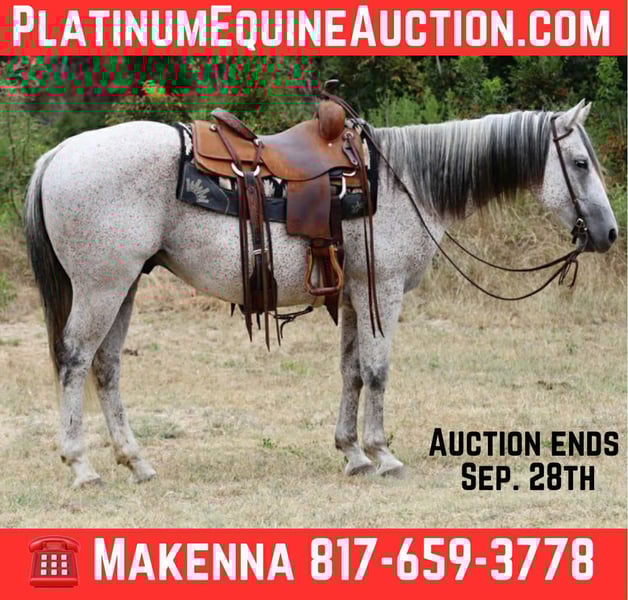 ONLINE AUCTION Place your bids at www.PlatinumEquineAuction.com Starting Bid $3500 Auction ends September 28th, 2025 Need a new saddle? Check out White Rock Saddles on our website or Facebook Pyro is 12-year-old grey gelding standing 15 hands tall and every bit as handsome as he is fun to ride. He’s the kind of horse that makes you want to saddle up and go, whether it’s for a relaxing evening ride or a full day out on the trails. Out on the trails, Pyro really shines. He’s confident, surefooted, and happy to lead or follow. He handles new country with ease, crosses obstacles willingly, and rides out alone or in a group. He’s the type you can trust to take care of you while still giving you that fun, forward ride that makes every trip enjoyable. Pyro is a well-rounded, versatile gelding with plenty of life in him. In the arena, he rides around soft and responsive. He’s been rode English as well and makes it super fun! If you’re looking for a good-minded, flashy gelding who’s safe, reliable, and fun, Pyro is the total package. He’s a true all-around partner with plenty of heart and the kind of looks that will turn heads wherever he goes. We are located in Lipan Texas but have reputable haulers that go all over the country, including Hawaii and Canada. Call or text and I’ll be happy to answer any questions Makenna Hartzell 817-659-3778. ONLINE AUCTION Place your bids at www.PlatinumEquineAuction.com Starting Bid $3500 Auction ends September 28th, 2025 Need a new saddle? Check out White Rock Saddles on our website or Facebook