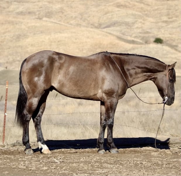NLINE AUCTION Place your bids at www.PlatinumEquineAuction.com Starting Bid $3500 Auction ends December 15th, 2024 Need a new saddle? Check out White Rock Saddles on our website or Facebook! If you’re looking for the perfect Christmas present for the whole family. Alvie is a remarkable 11 year-old gelding is a true 15 hands and a striking grulla coat that gleams in the sunlight. Alvie is not just visually stunning; he boasts extensive experience as an exceptional trail horse tailored for families and beginner riders alike His history includes participation in overnight trail rides and 4-H shows, demonstrating his adaptability across various environments from serene paths to bustling ranch work involving cattle. Alvie is great with obstacles, flags,tarps and is traffic safe. With a well rounded skill set tailored for both recreational riding and competitive disciplines like competitive trail riding and ranch riding games, Alvie embodies versatility at its finest.This kid-safe companion has been meticulously trained to navigate logs and water with ease, proving himself reliable whether out alone or alongside other horses. A natural lesson horse, in the arena he provides consistent performance even after time off, showcasing smooth transitions and maintaining great cadence throughout all gaits qualities essential for any aspiring equestrian. His laid-back disposition makes him easy to catch. Alvie stands patiently for both vet visits and farrier appointments; loading into trailers presents no challenge either a testament to his calm nature. He is safe for children to handle. Alvie is a saint he will stand like a soldier all day long. For those considering bringing this treasure home, transportation options are readily available. Schedule your appointment today to experience firsthand why Alvie is the perfect addition for any family seeking companionship and loyalty wrapped up in this beautiful boy. Please contact Longhorn Ranch Dina @ 831-537-1915 located in Paicines ca to come meet this special boy. ONLINE AUCTION Place your bids at www.PlatinumEquineAuction.com Starting Bid $3500 Auction ends December 15th, 2024 Need a new saddle? Check out White Rock Saddles on our website or Facebook!