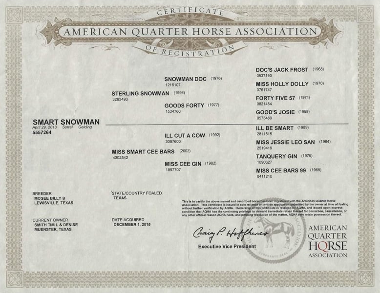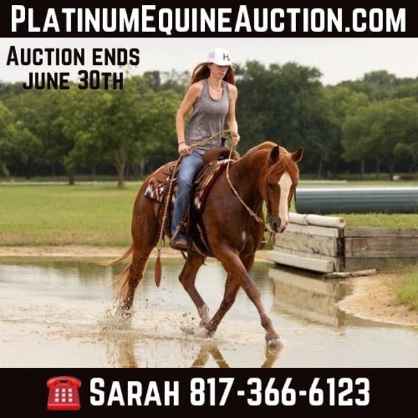 ONLINE AUCTION PLACE YOUR BIDS AT PLATINUMEQUINEAUCTION DOT COM $3500 STARTING BID AUCTION ENDS JUNE 30TH Let me formally introduce all of you to one of the easiest to ride and versatile geldings you can possibly find on the market today. A Smart Snowman is an 11yr old, 15.1hh, AQHA registered gelding. “Smarty”, as he’s affectionately called, will fit a wide range of riders. Whether you want to go have fun at ranch horse shows, kick it with friends out on the trails, or just enjoy a fun ride in the arena THIS gelding will do the deal. In the arena, Smarty has been shown in most all ranch horse classes for the last eight years. He has a wonderful cadence in all gaits with smooth transitions, turns around easily and correctly, and has a simple change. He is buttery soft in your hands and stays in tune to your seat and legs. On trail courses, bridges, logs, gates, and drags are all a breeze to him and if he questions what’s in front of him he always looks to you for guidance. Outside of the arena, Smarty has been on both group and solo trail rides throughout North Texas and into Oklahoma. He does well going out alone and has no issues leaving the group if you’d like to go do some solo exploring with him. If there is a body of water nearby you’d like to take a dip in, take Smarty with you! This guy absolutely loves cooling off in the water; whether it’s a creek, river, or lake he’s happy to go for a swim. Not only has he been trail ridden, but Smarty also has participated in a local parade through town and grand entries for PRCA rodeos. Smarty has also been used outside for ranch chores such as helping gather and sort cattle as well helping start several horses and one pony mule. He’s lots of fun to ride outside and to work livestock on as he has a ton of natural cowsense which is no surprise after taking a look at his pedigree. Smarty is great to be around on the ground and stands for grooming, fly spraying (both spray bottle & aerosol), bathing, blanketing, saddling, bridling, and for the farrier. He’ll stand at a mounting block if you need assistance into the saddle and will also ride bareback just as easily as he does saddled. Want to show off to your friends? Take the bridle off and go anywhere you want at any speed! Smarty is easy to catch out in the pasture, loads and unloads from a trailer like a champ, and hauls easily. He is UTD on all routine care from vaccinations to his teeth and has a recent vet exam on file which can be found on our website. He’s sound, clean legged, can go barefoot with no issues, requires no maintenance, and will x-ray clean all the way through. Whether you want to hit the show pen, hit the trails, or just want a horse that’s easy to ride everyday of the week he will fit your wants and needs! For additional pictures and information on Smart Snowman you can visit our website www.hspurhorses.com. A link to his YouTube Playlist can also be found there with over an hour worth of videos to be watched. We’re more than happy to help assist with hauling anywhere and invite you to come see Smarty in person at our place in Weatherford, Tx. For any questions and to talk about if Smarty could be the right fit for you, please contact Sarah at H Spur Performance & Versatility Horses 817-366-6123