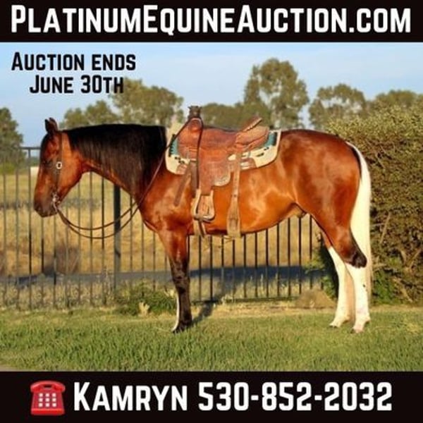 ONLINE AUCTION PLACE YOUR BIDS AT PLATINUMEQUINEAUCTION DOT COM $3500 STARTING BID AUCTION ENDS JUNE 30TH Meet Amigo a 11 year old APHA registered 15.2 hand gelding if you’re in search of a horse that commands attention and admiration in the show pen, look no further than Amigo. This magnificent horse is the pitome of elegance and versatility, making him a standout in any setting. Amigo isn’t just a horse; he’s an experience. His fancy appearance and confident demeanor turn heads and capture hearts wherever he goes. Whether in the arena, on the trails, or in town, Amigo exudes a presence that is simply unforgettable. Amigo is a seasoned trail horse with an impressive array of experiences under his belt. Amigo will go anywhere without hesitation, handling deep creeks, logs, bridges, and mud with ease. He has a brisk, efficient walk perfect for long trail rides and he will go all day long with no quit in him this boy doesn’t get tired wether your climbing mountains or just going down the neighborhood trails. Amigo is unfazed by bikes, scooters, strollers, hikers, quads, semis, rushing traffic, and wildlife. One of Amigo’s favorite activities is swimming and playing in the water, where he loves to splash and cool off after a hot day of riding. Amigo is just as impressive in the arena as he is on the trails. His extensive training ensures he performs beautifully and responds accurately to commands: – Knows His Leads: Seamless transitions that highlight his training. – Slide Stops and Spins: Demonstrates advanced skills with precision. – Works Off Your Legs: Highly responsive to leg cues. – Backs Up and Side Passes: Perfect for opening gates and intricate maneuvers. – Walk/Trot/Lope on a Loose Rein: Offers a smooth, relaxed ride in all gaits. – Smooth, Slow Rocking Horse Lope: Provides a comfortable and desirable riding experience that everyone covets. With his natural talent and training, Amigo is poised to excel in the show pen. His capabilities make him an ideal candidate for on-the-rail ranch riding classes and other competitive events. His striking appearance, combined with his smooth movements and responsiveness, will undoubtedly make him a favorite among judges and spectators alike. Amigo is a substantial horse, built to carry riders with ease. His size and strength make him a versatile choice for a variety of riders, ensuring comfort and confidence in any situation. Amigo is a rare gem, offering an unparalleled combination of beauty, versatility, and an easy-going nature. His extensive experience, both on the trails and in the arena, makes him a valuable addition to any equestrian family. If you’re ready to add a show-stopping superstar to your stable, Amigo is the horse for you. He loads in the trailer easy as pie. Stands to be saddled, groomed, bathed. He is great in a stall or in a pasture with others. He is UTD on shots, teeth, worming, and shoes. Contact us today, KW RANCH Kamryn 530-852-2032 to schedule a visit and see Amigo in action. He’s ready to meet you and become your next equine partner! Located in Pleasant Grove, CA.