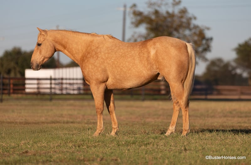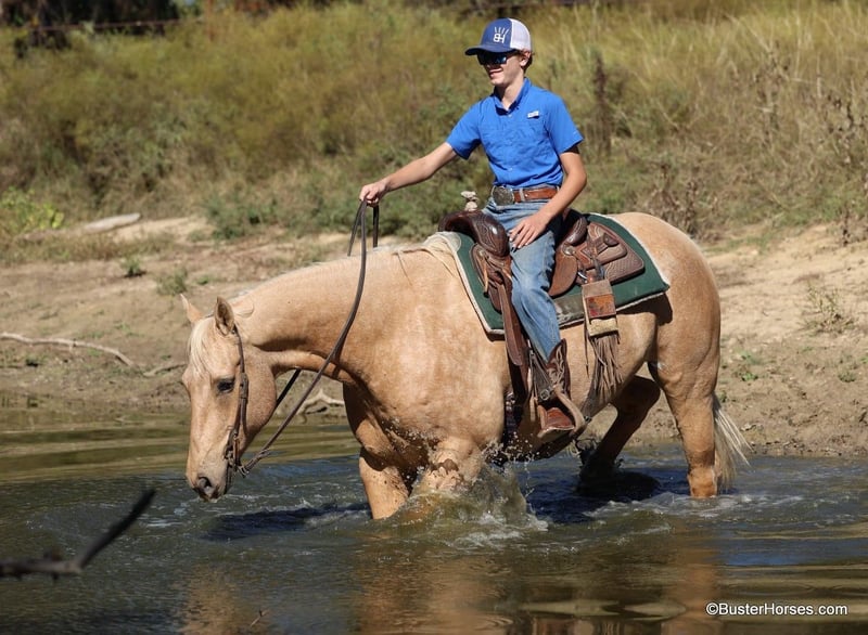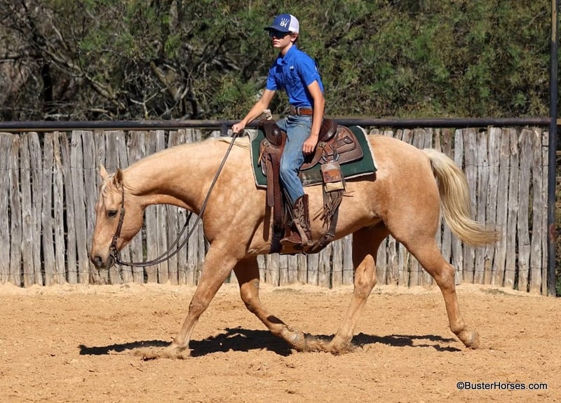 ONLINE AUCTION Place your bids at www.PlatinumEquineAuction.com Starting Bid $3500 Auction ends December 1st, 2024 Need a new saddle? Check out White Rock Saddles on our website or Facebook! “Cheesy” – 15.2H, 11 year old palomino quarter horse gelding. This is one of the kind-est, most uncomplicated, and solid geldings we have gotten ahold of this fall. He is absolutely GORGEOUS, big boned, tall, and as thick as they make them. If you are looking to mount some big people, but don’t want to go the draft cross route – then don’t look past cheesy! He is as easy to operate as they come, he is naturally low headed, and he has incredibly smooth gaits. You can pitch him away one handed and lope off with a drink in your hand if you want to – and you don’t have to be a great horseman to do it smoothly on Cheesy! He is naturally balanced, very easy to ride, not lazy, but in no hurry and not remotely hot either. If his rider is timid or nervous, Cheesy feels it and he just creeps along as slow as he can go. If his rider gets unbalanced and gets to leaning or bouncing, he literally steps underneath you, even when he is traveling at a trot or a lope! He is very easy to navigate around with one hand, and very simple to move up into a trot and a lope. He stops on a dime, but not so hard that it will throw anyone overboard either! He is an easy keeper, has great big hard feet, and is as low maintenance of a horse as you could buy. He has been there and done that and seen that, and is the same horse daily or once a year. He lives out with a pen of geldings right now, but he is happy kept up in a stall, he loves the extra attention and to be spoiled. He just had front shoes done last week, and had his teeth done by an equine dentist last month! His age isn’t just a bunch of us guessing, its been verified by 2 equine dentists, 2 vets, and also off of his history. He is the perfect age, and checks all the boxes of what everyone is looking for. He has also been used in the turn back pen, has been roped off of extensively, used on a ranch, and he knows what the barrels and the poles are (though he isn’t very fast!) – and has been ridden English at the low levels! We are headed to an entry level local holiday jumper show with him ourselves soon! He loves to go to town, is exceptionally good in traffic and commotion (he literally will take a nap in the middle of it!) and he will be a first pick when we load up to go to the upcoming holiday parades! Please call anytime for more information Buster Horses Ashley 214-605-7174 Cheesy is located in Weatherford, TX – one hour from Dallas / Fort Worth International Airport. He is an easy day trip or fun overnight trip to come try out, from anywhere! We are experienced knowledgeable sellers and we can help with quickly arranging affordable shipping to any buyer’s location – we have experience shipping horses worldwide – including regularly to Hawaii, Canada, Mexico, Europe, and South Africa. ONLINE AUCTION Place your bids at www.PlatinumEquineAuction.com Starting Bid $3500 Auction ends December 1st, 2024 Need a new saddle? Check out White Rock Saddles on our website or Facebook!