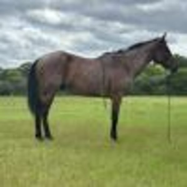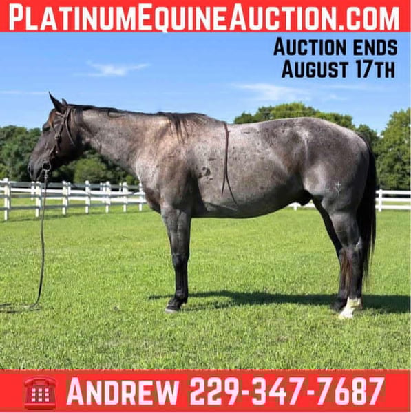 ONLINE AUCTION Place your bids at www.PlatinumEquineAuction.com Starting Bid $3500 Auction ends August 17th, 2025 Need a new saddle? Check out White Rock Saddles on our website or Facebook Reno is a 2013 model bay roan quarter horse gelding standing 15.3 hands tall. He has a very athletic build. He stands to be saddled, is very gentle on the ground, and takes the bit with ease. He walks out alone and with other horses without a problem. We have used him in the arena and he has a nice trot and lope. Reno is a trail horse deluxe as he spooks at nothing and stays level headed through everything. He isn’t afraid of loud noises or quick movements and will walk over anything in his path. He would be a great horse for someone to learn how to ride on as he is very patient. He rides bareback and with a saddle. He has been ridden everywhere- from trails, through town, along the road, and on quail hunts. He will walk through water, over logs, or through tight spaces without a second thought. Reno is extremely affectionate and loves getting attention every day. He walks up in the pasture and loves getting brushed. He loads and unloads effortlessly and is truly a pleasure to have around the farm. UTD on coggins and vaccines. Contact Andrew Dismuke 229-347-7687 with any questions. Located in Dawson, GA. ONLINE AUCTION Place your bids at www.PlatinumEquineAuction.com Starting Bid $3500 Auction ends August 17th, 2025 Need a new saddle? Check out White Rock Saddles on our website or Facebook