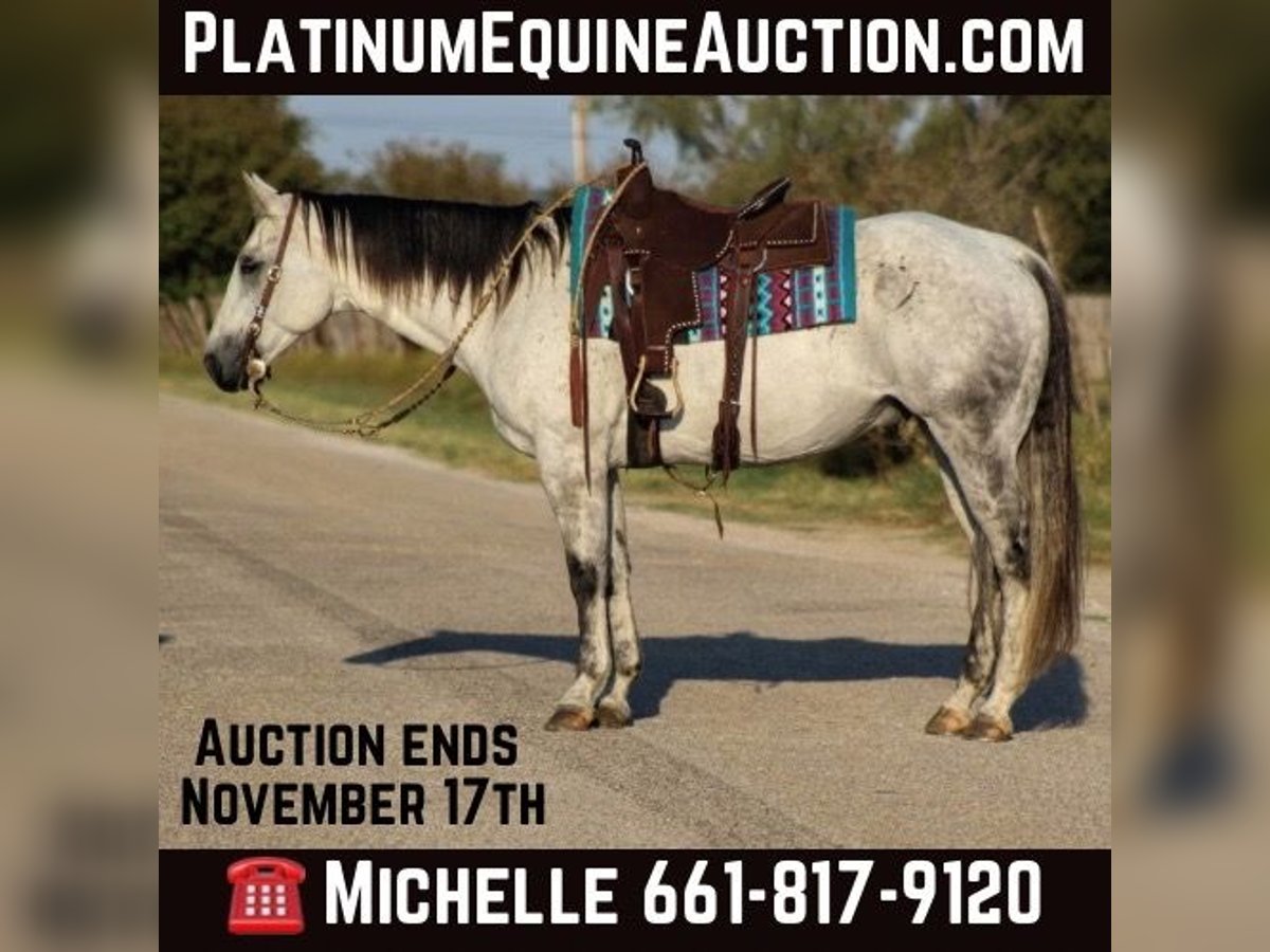 ONLINE AUCTION Place your bids at www.PlatinumEquineAuction.com Starting Bid $3500 Auction ends November 17th, 2024 Need a new saddle? Check out White Rock Saddles on our website or Facebook! You guys aren’t going to want to miss this BIG gorgeous grey gelding ! Dos as we call him is in the prime age of his life at 11 years old standing 15.2 hds tall. Dos is a true blue real ranch horse and has been used extensively on the ranch for all the ranch chores including doctoring sick cattle outside , loading trucks , gathering in steep country, checking fences . He is one you can run one down on in the pasture and know he will be strong to the horn . He has also been used a lot at the feed yard riding pens, doctoring and loading trucks. Dos is one handed broke , will lope right out of his tracks everytime , he has a good turn around and stop on him . He’s EXTREMELY well broke and would be a great candidate to take to the show pen in the ranch riding events , or go show him in the English also. Dos is a gorgeous mover, user friendly and BROKE like one should be. If you’re not looking for all the fancy stuff and just want your next trail blazer don’t worry Dos does that job just fine and is a blast out on the trail. Hes sure footed, he will go anywhere you point him down the trails, he will cross logs, bridges, water, train tracks, goes up and down any sized hills. He has also been rode numerous times out down the busy hwy and city streets with traffic including down at the historical Fort Worth Stockyards. Dos will not disappoint!! He’s everything people search for when looking for there new equine partner ! He is currently pastured with 3 other horses and gets along great in a herd or can be stalled also. He stands for the farrier, loads and unloads off the trailer like the seasoned veteran he is. Watch his video and you will fall in love!! Contact us to come try him, or we can set up a FaceTime also. If you need help with transport don’t hesitate to ask we have a list of reputable haulers that can get him safely to your doorstep world wide. Call M $ Performance Horses Michelle 661-817-9120 with any questions. Located in Stephenville, TX. ONLINE AUCTION Place your bids at www.PlatinumEquineAuction.com Starting Bid $3500 Auction ends November 17th, 2024 Need a new saddle? Check out White Rock Saddles on our website or Facebook!