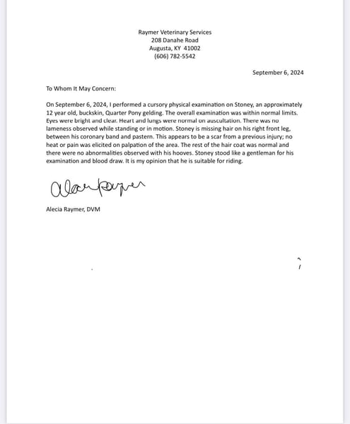 ONLINE AUCTION Place your bids at www.PlatinumEquineAuction.com Starting Bid $3500 Auction ends September 29th, 2024 Need a new saddle? Check out White Rock Saddles on our website or Facebook! Every parent dreams of their kid’s horse to match daddy’s big buttermilk buckskin, right? We’d like to introduce Stoney. He stands 14 Hands and is 12 years old. He is a stunning buckskin gelding with a long mane and tail. We get compliments on him everywhere we go. He is sound, no weave/crib or loading issues. Stoney has been trail ridden all throughout our farms in KY checking fences, gathering pairs, moving young bulls to different pastures and various other jobs. He also rides well in an arena setting. He has that “rocking chair” canter that everyone wants and a smooth trot. We feel that he would be a great step up for a kid or perfect for an adult that is looking for that shorter, reliable trail mount. Stoney is healthy and an easy keeper. He pastures well with other horses and cattle. Stoney is no stranger to our family and has been connected to us the past couple years but is ready for his next person. Please schedule an appt to come meet/ride him. Text or call if anyone has any questions. Located in Maysville, KY. Call Kati Ream 606-407-5747. ONLINE AUCTION Place your bids at www.PlatinumEquineAuction.com Starting Bid $3500 Auction ends September 29th, 2024 Need a new saddle? Check out White Rock Saddles on our website or Facebook!