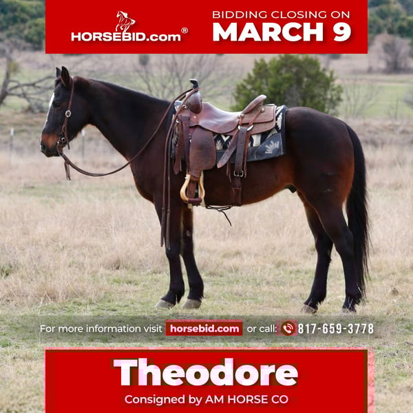 ℳ𝒶𝓇𝒸𝒽 ♦️𝐑𝐈𝐃𝐄𝐑'𝐒 𝐂𝐇𝐎𝐈𝐂𝐄♦️ Happening now thru MONDAY | MARCH 9th - Available EXCLUSIVELY on HorseBid's website! For more details and to register visit: www.Horsebid.com CONSIGNOR CONTACT: AM HORSE CO 817-659-3778 LOCATION: Mineral Wells, TX BREED: Quarter horse REGISTERED: No REGISTERED NAME: Theodore COLOR: Bay HEIGHT: 14.2 AGE: 14 GENDER: Gelding Theodore is 14 year-old bay gelding standing 14.2 hands tall and every bit as handsome as he is fun to ride. He’s the kind of horse that makes you want to saddle up and go, whether it’s for a relaxing evening ride or a full day out on the trails. Out on the trails, Theo really shines. He’s confident, surefooted, and happy to lead or follow. He handles new country with ease, crosses obstacles willingly, and rides out alone or in a group. He’s the type you can trust to take care of you while still giving you that fun, forward ride that makes every trip enjoyable. Theodore is a well-rounded, versatile gelding with plenty of life in him. In the arena, he rides around soft and responsive. He’s been rode English as well. If you’re looking for a good-minded, flashy gelding who’s safe, reliable, and fun, Theo is the total package. He’s a true all-around partner with plenty of heart and the kind of looks that will turn heads wherever he goes. We are located in ♦️Mineral Wells Texas♦️but have reputable haulers that go all over the country, including Hawaii and Canada. Give me a call or text and I’d be happy to answer any questions! 817-659-3778