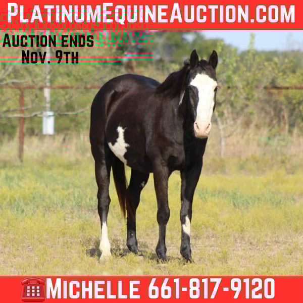 ONLINE AUCTION Place your bids at www.PlatinumEquineAuction.com Starting Bid $3500 Auction ends November 9th, 2025 Need a new saddle? Check out White Rock Saddles on our website or Facebook If you’ve been searching for that one special horse that the whole family can enjoy, your search ends here. Meet Bandit — a stunning 14-year-old black and white paint gelding standing 14.3 hands tall and built just right. With his picture-perfect chrome and kind eye, Bandit catches attention everywhere he goes.This gentleman has done it all — from long days as a ranch horse riding fence lines and gathering cattle, to countless hours as a trustworthy trail partner and a steady family mount. Need a dependable horse for lessons or therapy work? Bandit has the patience, heart, and calm nature that make him a perfect fit. He’s sure-footed and confident, will go anywhere you point him, and handles all kinds of terrain with ease. Bandit crosses water, logs, bridges, and navigates tarps and obstacle courses without hesitation. He’s traffic safe and has even ridden through the famous Fort Worth Stockyards, weaving through crowds, cars, wagons, and loud music like an absolute pro. Bandit is that once-in-a-lifetime kind — the horse you can put your trust in, no matter who’s in the saddle. He’s gentle, broke, and reliable with a soft heart and a willing mind. He ties, loads, stands for the farrier, bathes, and takes everything in stride. We are open to anyone interested in him to schedule a time to come see him or if you can’t make it schedule a FaceTime showing to see him. If you need help with transport don’t hesitate to ask we have a list of reputable haulers that can get him safely to your doorstep WORLD WIDE including, Alaska , Mexico, Hawaii, Canada and anywhere in between from Stephenville, TX. Contact Michelle with M $ Performance Horses 661-817-9120 with any questions. ONLINE AUCTION Place your bids at www.PlatinumEquineAuction.com Starting Bid $3500 Auction ends November 9th, 2025 Need a new saddle? Check out White Rock Saddles on our website or Facebook