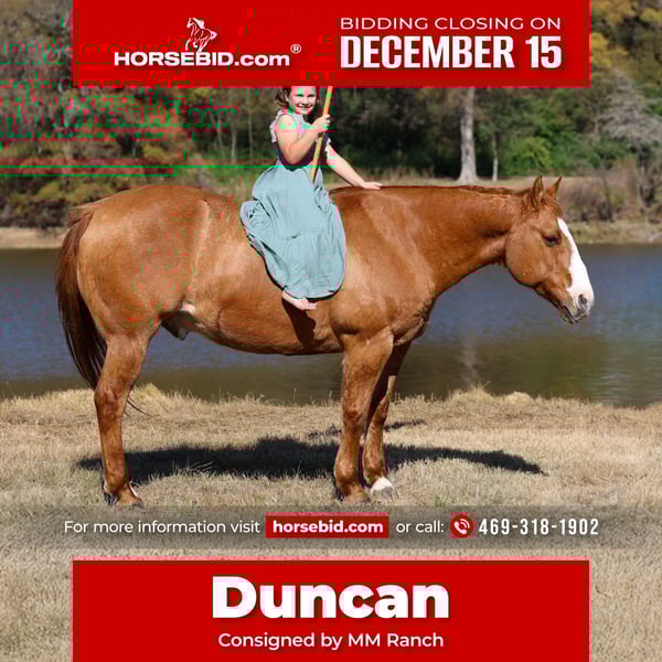 🎄𝐓𝐇𝐄 𝑯𝒐𝒍𝒊𝒅𝒂𝒚 𝐂𝐋𝐀𝐒𝐒𝐈𝐂🎄 Happening now thru MONDAY | DECEMBER 15th - Available EXCLUSIVELY on HorseBid's website! For more details and to register visit: www.Horsebid.com CONSIGNOR CONTACT: MM Ranch 469-318-1902 LOCATION: Forney, TX BREED: Quarter Horse REGISTERED: No REGISTERED NAME: Duncan COLOR: Red Dun HEIGHT: 14.3 AGE: 13 GENDER: Gelding Duncan is an 13 year old stunning red Dunn ranch gelding that is safe for the whole family. No matter your age or horse experience you can ride and enjoy this amazing horse. He is a big stout made sturdy gelding that is 14.3 hands and weighs 1250 lbs. He has absolutely unmatched eye appeal that will get you noticed anywhere you go! Plenty of size, bone and foot to handle any rider and terrain! Duncan was raised on a big ranch in Montana and used daily. We bought him from an older gentleman that raised and trained him. He is a finished tried and true all around ranch horse. He’s spent his life doing a real job— roping and doctoring yearlings outside, branding calves, checking fence, and working in the feedlot. Duncan has the been there-done that mentality that makes every ride so enjoyable and stress-free. Whether you’re looking for a trustworthy partner for long days on the ranch or a gentle, seasoned horse the whole family can enjoy, this is him!! He has all the fancy buttons. Riding him is like driving a Porsche. He will pick up and go when asked but prefers a pleasant speed of a walk or his silky smooth slow jog. You can lope him off from a stand still with correct lead departure. He has slow correct spins. If you want you can turn him on like a reining horse. Soft side passes so can open and close gates on him and/or check your mail. He has controlled speed variations, will not get hyper or high strung. Duncan crosses logs, water, ditches, mud bogs, and steep banks with ease and confidence. Does not have a spooky, flighty nature, absolute no buck or bad habits, and the best part he has the most affectionate, willing-to-please attitude you will ever come across. We have never been around a horse who is so excited to see you every single day! He will always greet you at the gate and come up out of the pasture straight to his stall. We hope he finds a good loving home so someone else gets the opportunity to ride and enjoy such an amazing horse! Duncan is sound with no health issues or maintenance. He is an easy keeper. Up to date on shots, worming, feed, teeth, coggins. He is ready to go. We can and will help arrange affordable shipping if needed.